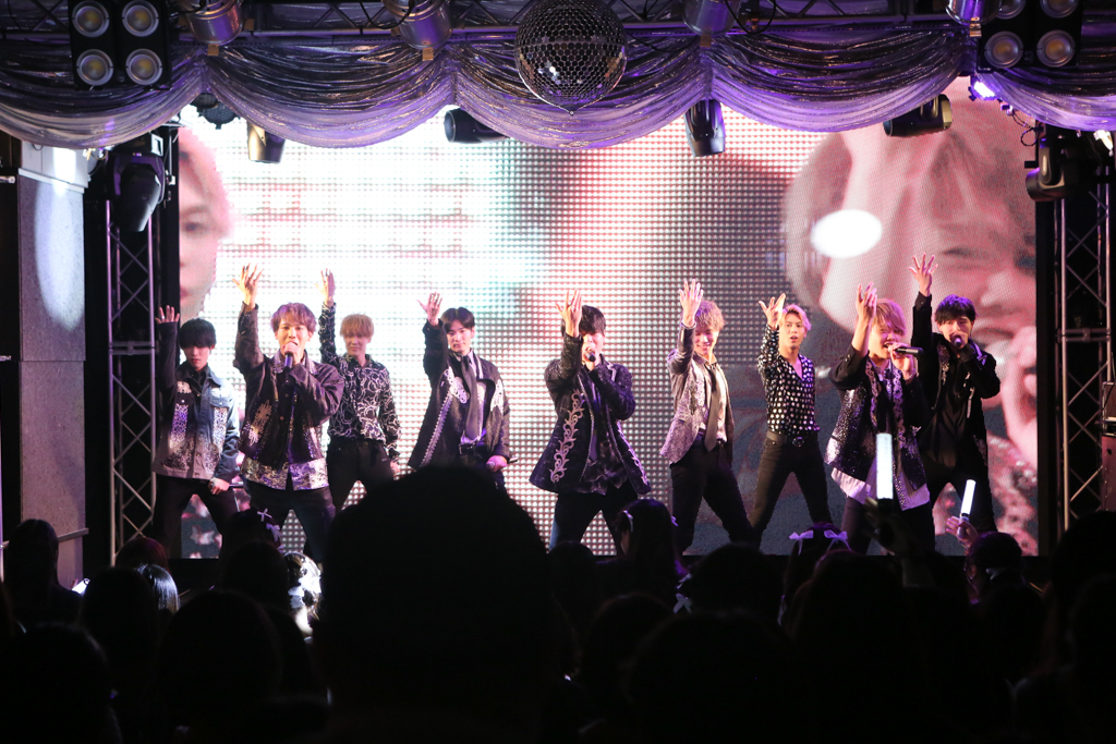 続いてLotteriezは、ンングル「僕らのPRIDE」のC/Wに収録したカバーシリーズの中から「今夜はブギー・バック」(小沢健二 featuring スチャダラパー)を披露。原曲よりも華やかさを増せば、ビートもアップ。心地好いグルーヴナンバーに乗せ軽やかに舞いながら、観客たちをスウィートなパーティへ誘いだす。続く「Shangri-La」(電気グルーヴ)も、カバーシリーズ歌。原曲の持つ壮大さを生かしながら、7人は「夢でKISS KISS KISS」と自分たちの懐へ観客たちを抱きしめるよう歌いかける。その誘いに触れ、一緒に「KISS KISS KISS」と歌いながら、ファンたちも彼らの胸の中へ心を飛び込ませていた。