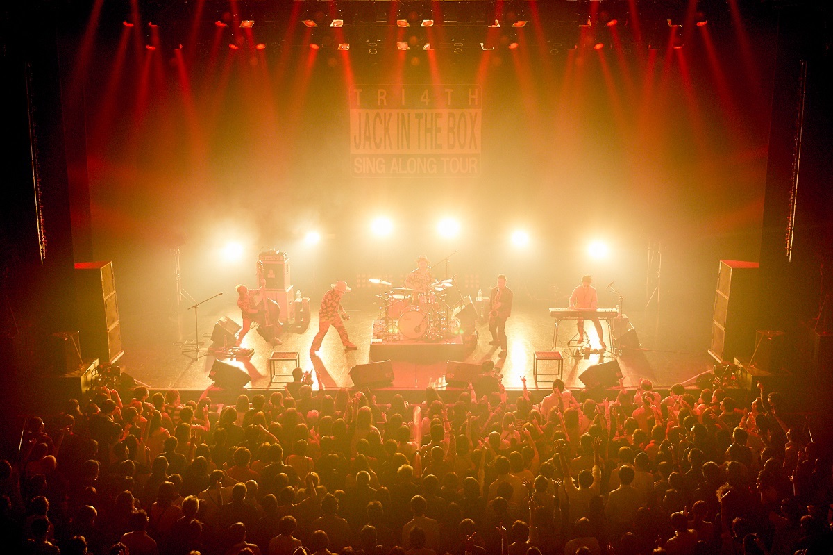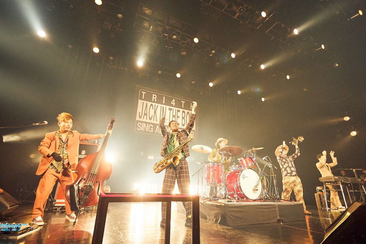 インストバンドが“みんなで歌おうぜツアー”だなんて、いかしてるじゃないか。踊れるジャズバンド、TRI4THのツアータイトルは『SING ALONG TOUR』。そこにたとえ歌詞がなくとも、熱くほとばしる思いを唇に乗せればそれは全て歌だ。ニューアルバム『jack-in-the-box』で切り開いた新境地をステージで再現する、今日はツアーファイナルの地、東京・マイナビBLITZ赤坂。バンド史上最大キャパの会場で、最高のチャレンジが今始まる。