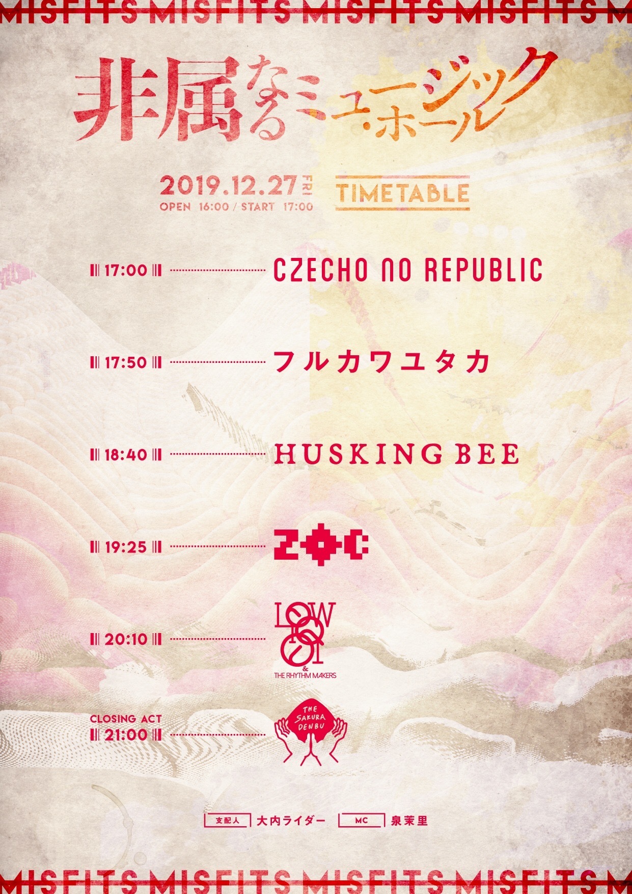“太平洋不知火楽団”“科楽特奏隊”としておなじみの大内ライダー氏が“支配人”となってプロデュースする本イベントは、2020年にバンド結成10周年を迎えるCzecho No Republicからスタート。その後はフルカワユタカ(Dr. Base Ball Bear 堀之内大介)、HUSKING BEE、ZOC、そしてトリにLOW IQ 01という、ジャンルの垣根を超えた“非属なる”アーティストが集結することとなる。トリを迎えた後にクロージングアクトとして、この日がバンドデビューとなる新日本プロレス所属の人気タッグ、ROPPONGI 3K[ロッポンギスリーケー]こと、SHO[ショー]&YOH[ヨー]がメンバーのTHE SAKURA DENBUがイベントのラストを飾り、対バンとなるHUSKING BEE・磯部正文提供曲のお披露目なども予定されている。