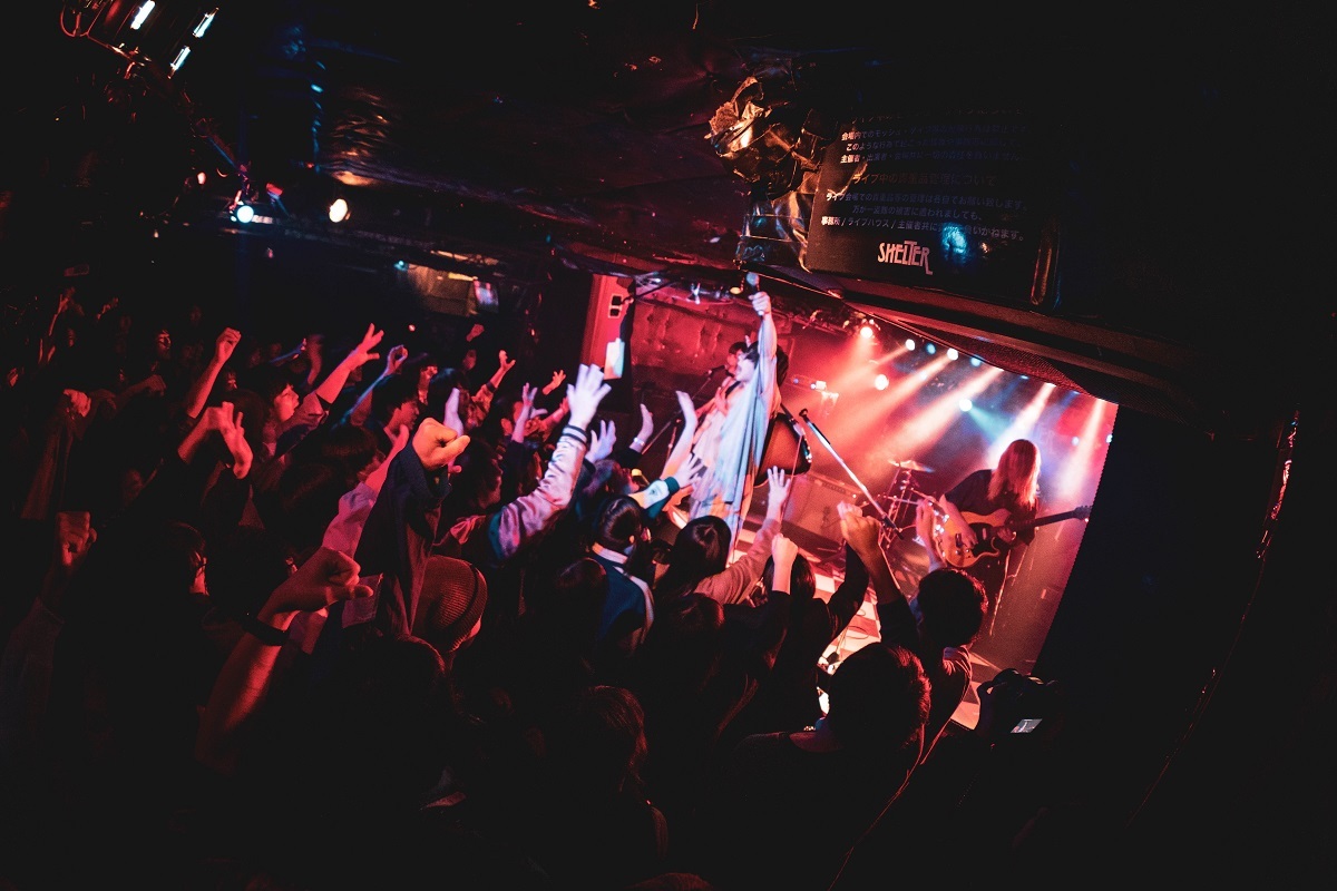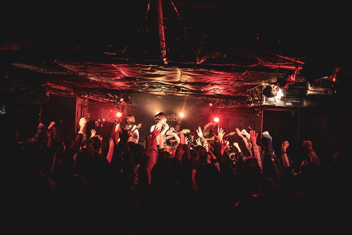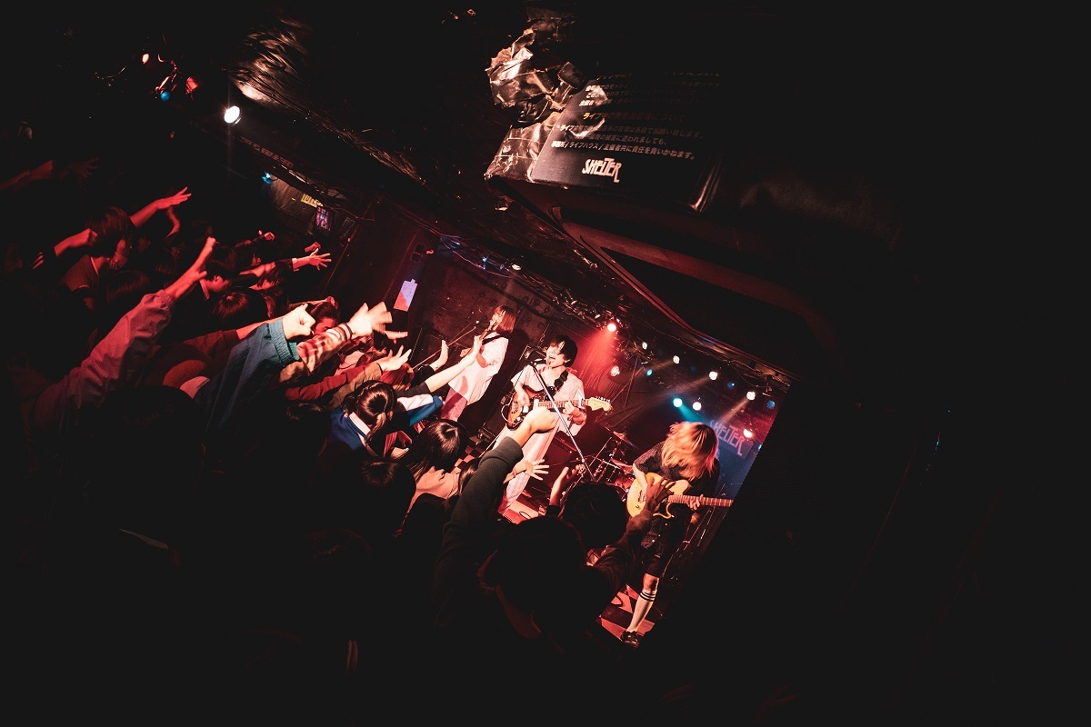 なかなかアクの強そうな気配があるが、いったいどんなバンドなのだろうか。ということで、11月28日、下北沢SHELTERでのライブに行ってきた。この日はバンドにとって2度目のワンマンライブで、フロアは満員。限定デモ付きチケットを買った人はここで引換を行うらしく、物販は盛況。制服姿の学生も、仕事帰りと思しき人も見受けられる。