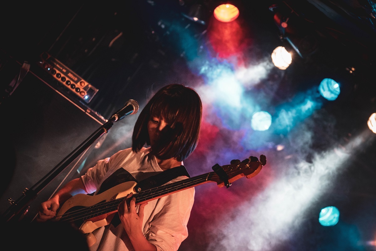 一捻りも二捻りもある曲ばかりだったここまでの流れに対し、7曲目には温かみのあるミディアムバラード「夜泣き」を披露。さらに、くぅの“2年前に阿佐ヶ谷で路上ライブをしたが、通りすがりの自称クラシックギター講師に「そんなんじゃ売れないよ?」と言われた”、“その時に彼から1000円もらったが、その1000円で今日のライブに来てほしかった”という話から「それでも」へ繋げると、曲が終わる頃には既に「嫌喘」のフレーズが鳴らされていて、次の曲へと継ぎ目なく繋げていく。まだ若いバンドのワンマンライブの場合、ともすれば“曲のお披露目会”になってしまうことも少なくないが、彼らの場合、(一部カポをはめるのに手こずっていた箇所はあったものの)曲間をスムーズに繋ぐような工夫が施されており、この日に向けて丹念に準備を重ねてきたこと、観客を夢中にさせたい、楽しませたいという気概が十分に伝わってきた。そしてその想いはファンにも届いているのだろう、「分かる人よければ合唱して締めましょう!」と促したアンコールの「スカートの中を覗く」はもちろんのこと、それ以外の曲でも観客は積極的に唄っていた。くぅがフロアへ向けたマイクの方にたくさんの歌声が集まっていく光景はとても温かなものだった。