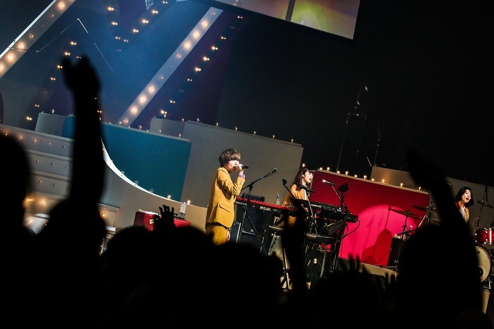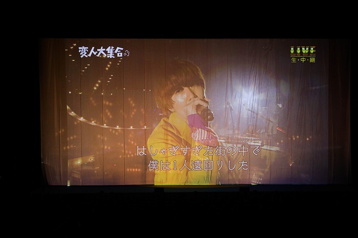 終盤では「セルマ」で「失恋を引きずりすぎる女」、「パラレルスペック」で「片想いを続けすぎる男」という男女のADの恋愛模様が展開され、「猟奇的なキスを私にして」のラストで男が女にキスをしようとするも、結局投げ飛ばされてしまうというオチ。仕事に戻ったADが川谷にカンペを掲げ、カメラが向くと、そこには「キラーボールで踊りませんか?」の文字が。もちろん、そこから「キラーボール」が始まり、間奏ではちゃんMARIが「小学生で音楽理論をマスターしたピアニスト」として紹介されるなど、客席は大盛り上がり。最後に川谷は「こんな変なライブに来てくれてありがとうございます」と笑い、「人との繋がりで助けられたから、いろんな人と関わってライブをしたかった」と企画の趣旨を説明。「アオミ」を届けて本編を締め括った。