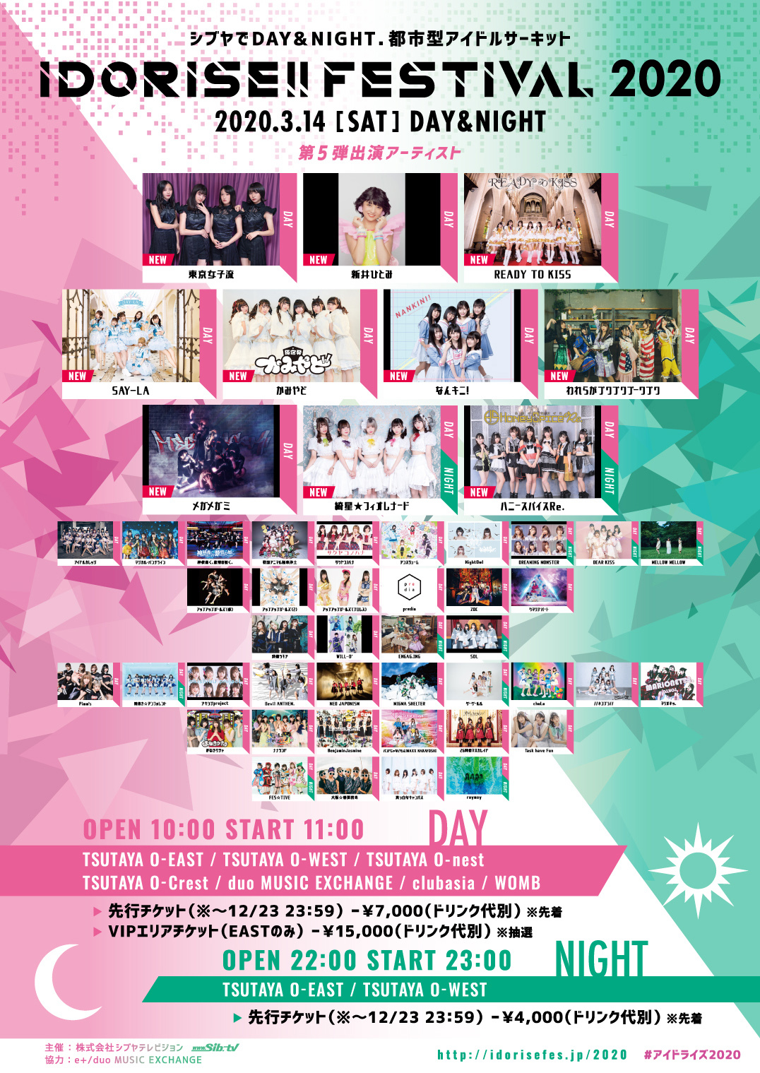 『IDORISE!! FESTIVAL 2020』はシブヤテレビジョンが主催するイベントで、DAYとNIGHTの2部構成。今回DAY公演の出演者として、東京女子流、新井ひとみ、READY TO KISS、SAY-LA、かみやど、なんキニ!、われらがプワプワプーワプワ、メガメガミ、綺星★フィオレナード、ハニースパイスRe.の10組が発表された。このうち綺星★フィオレナード、ハニースパイスRe.はNIGHT公演にも出演。今回の発表により、第一弾から合わせて50組の出演者が公開され、出演者は今後も追加されるとのこと。