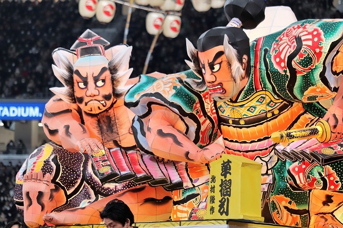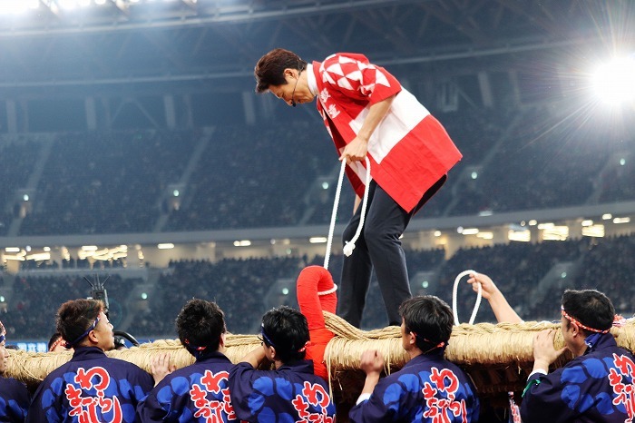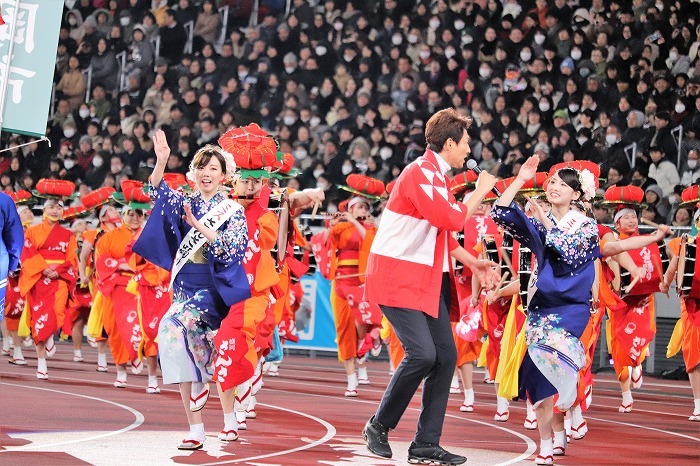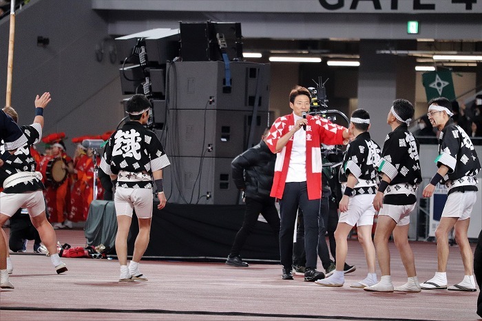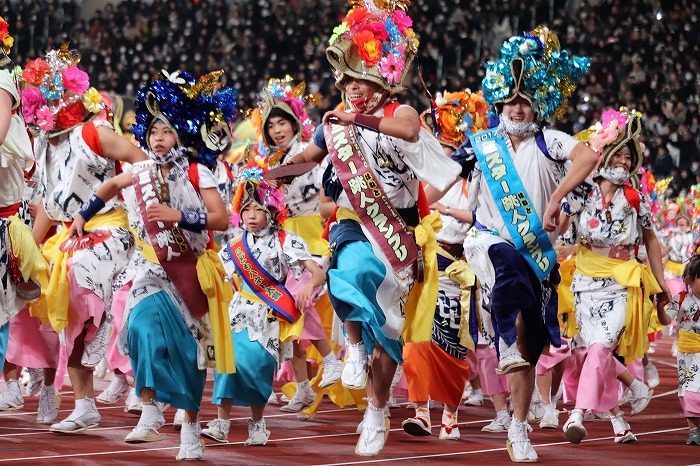 オープニング【文化パート】では、和太鼓集団・鼓童による演奏でスタート。静まりかえった国立競技場に荘厳な和太鼓の音が鳴り響く。そこに登場したのは松岡修造。そして秋田の竿灯祭り、盛岡のさんさ踊り、山形の花笠まつり、福島のわらじまつり、仙台すずめ踊り、青森のねぶた祭と、東北6県を代表する祭が披露された。松岡は参加者に果敢に突撃し、時には福島のわらじまつりで神輿のように担がれる大わらじの上に乗ってみたり、と誰よりも祭を熱く盛り上げていた。その後はマーチングバンド、フラッグバトントワリングが先導する中、国立競技場の近隣の街、学校、スポーツ関連、そして企業に関係する人々のセレブレーションパレードでトラックを一周するくらいの大行列をなしていた。