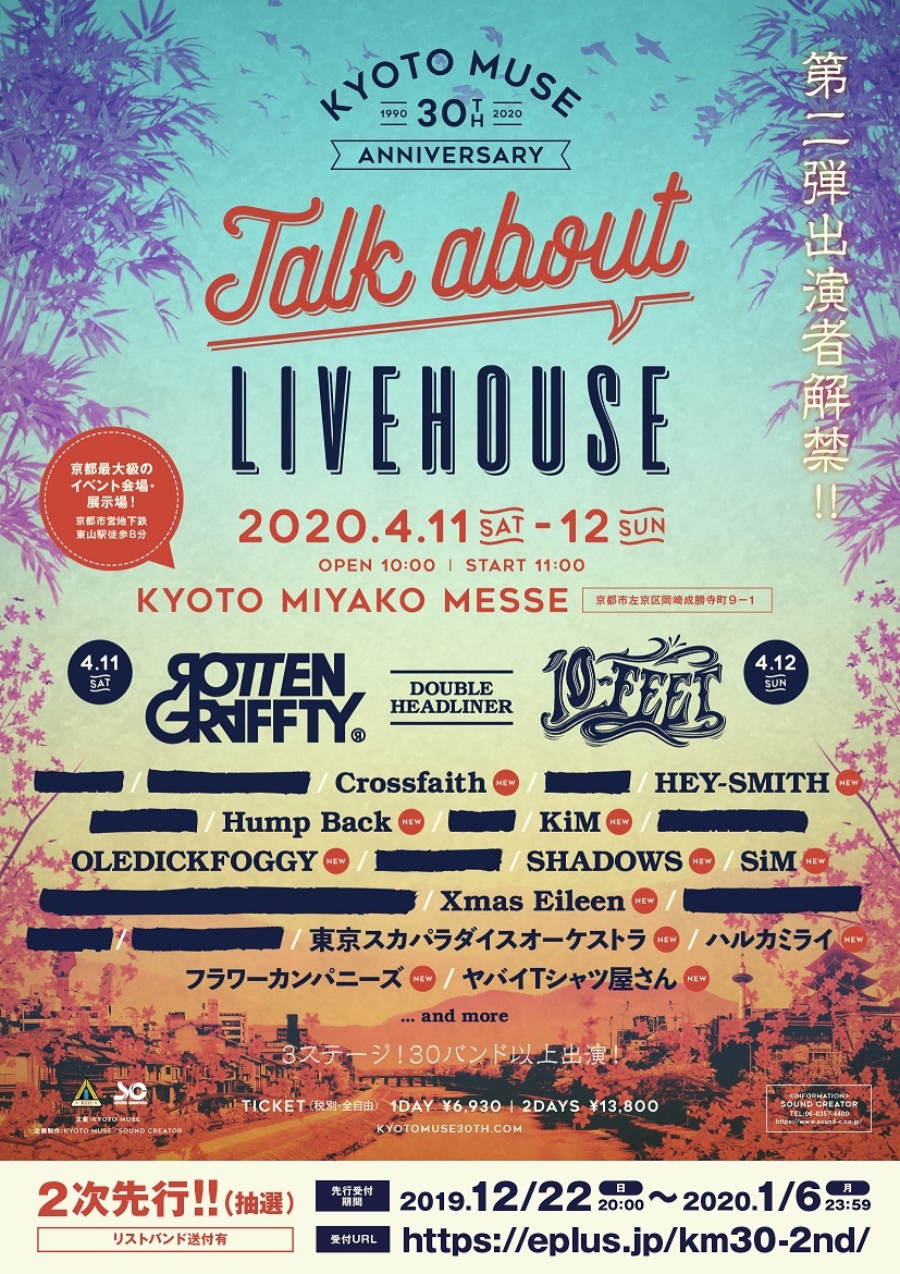 2020年4⽉11⽇(土)、12日(日)の二日間、京都市内のイベント会場 みやこめっせにて開催される、ライブハウス KYOTO MUSEの30周年記念イベント『KYOTO MUSE 30th Anniversary “Talk about LIVEHOUSE”』の第2弾出演アーティストが発表された。