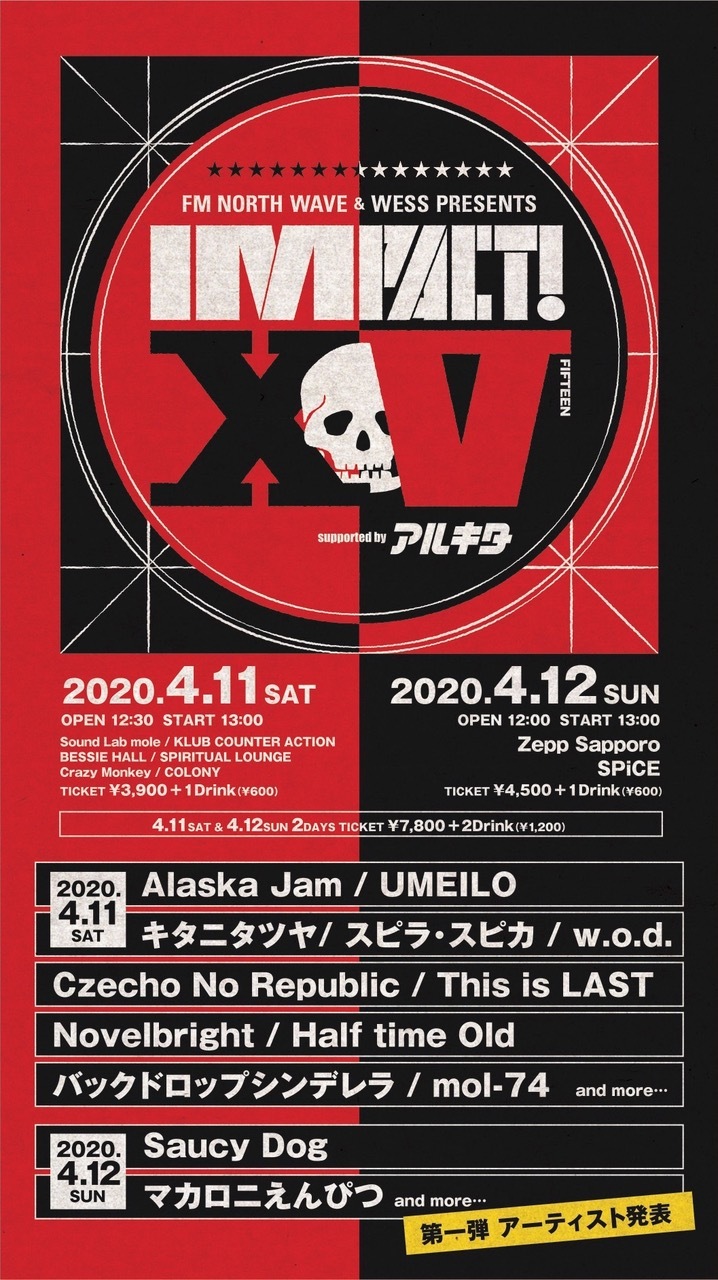 2020年4月11日(土)、12日(日)の2日間、ラジオ局FM NORTH WAVEとコンサートプロモーターWESSがタッグを組んで行う、北海道を代表するライブサーキットイベント『FM NORTH WAVE & WESS PRESENTS IMPACT!XV』が開催され、第一弾出演アーティストが発表された。
