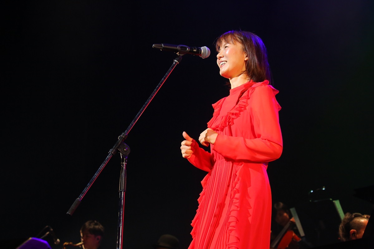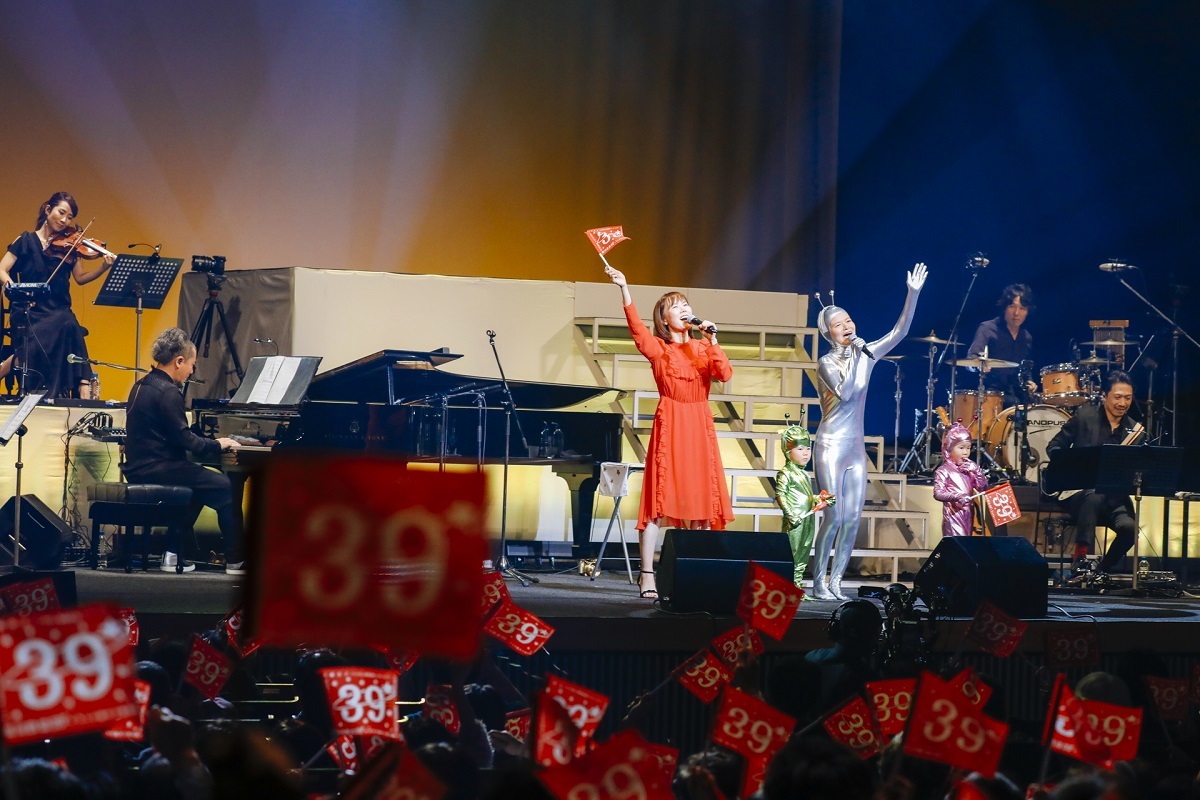 客席が暗転したあと、赤いワンピースに着替えて半﨑がステージに戻ってきたと思ったら、昨年「卒業宣言」をしたASAKO(半﨑の実姉)まで、宇宙人のコスプレ姿でピンクレディの「UFO」を歌いながら子連れでステージにカムバック。これで場内を大笑いさせると、これまでの静かに聴き入っていたライブの雰囲気がガラリと変わる。観客たちが一斉に赤い小旗を振るなか、半﨑が「愛の讃歌」を歌い、ライブはいよいよ終盤へ突入。