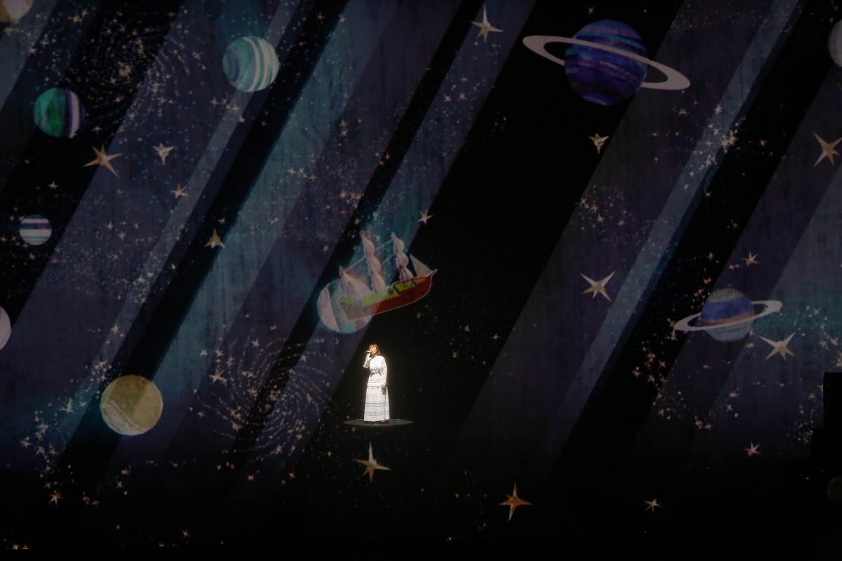 そこから、半﨑がピアノの弾き語りで歌う「最後まで」、歌に込めた思いが映像のなかで叶っていった「明日へ向かう人」は、いろんな人のさまざまな想いを蘇らせ、大人をとことん泣かせて感動はクライマックスへ到達。そうして舞台には再び紗幕が降り、始まったのはミュージカルタッチの新曲「満ちていく明日」だった。この曲中、半﨑は声量をマックスに高めていき、観客全員を大きな船へと乗せて、ポジティブな明日へと見事に誘ってみせた。