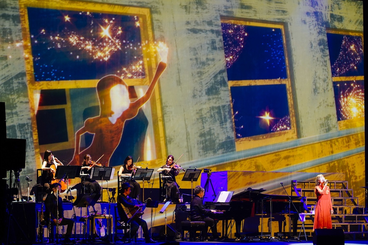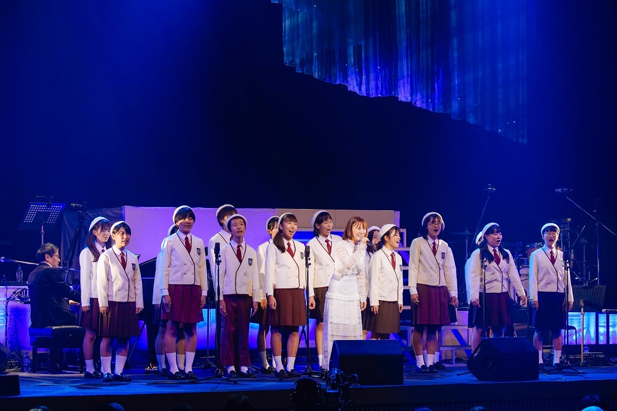 「すみませんバラードばかりで」といって、静かに涙を流していた観客をクスッと笑わせて平常心へと戻してあげる半﨑がなによりも素敵だった。このあと「大阪恋時雨」(先に行われたNHK大阪ホール公演では天童よしみがサプライズで登場!)でジャジーなサウンドをホールに響かせたあとは、本コンサートの音楽監督をつとめる武部聡志がスペシャルゲストとしてステージに登場。武部は「ハンカチが何枚あっても足らない。こんなに魂が宿った歌を歌える人はいません」と半﨑の歌を賞賛。その武部がピアノ、そこに伊東市少年合唱団も加わり「明日への序章」を合唱したシーンでは、子供たちの前ではなく同列に並んで歌う半﨑が印象的だった。この合唱で心がとことん優しく清らかになっていたからこそ、そのあとに武部の弾き語りをバックに歌った「母へ」はストレートに涙腺を直撃。“母”を歌い込まない歌詞で母親、子供の母でもある自分、子供目線のお母さん、その全世代に突き刺さる“母親像”を想像させ、人々を泣かせていくこの歌の威力はすごいものがあった。
