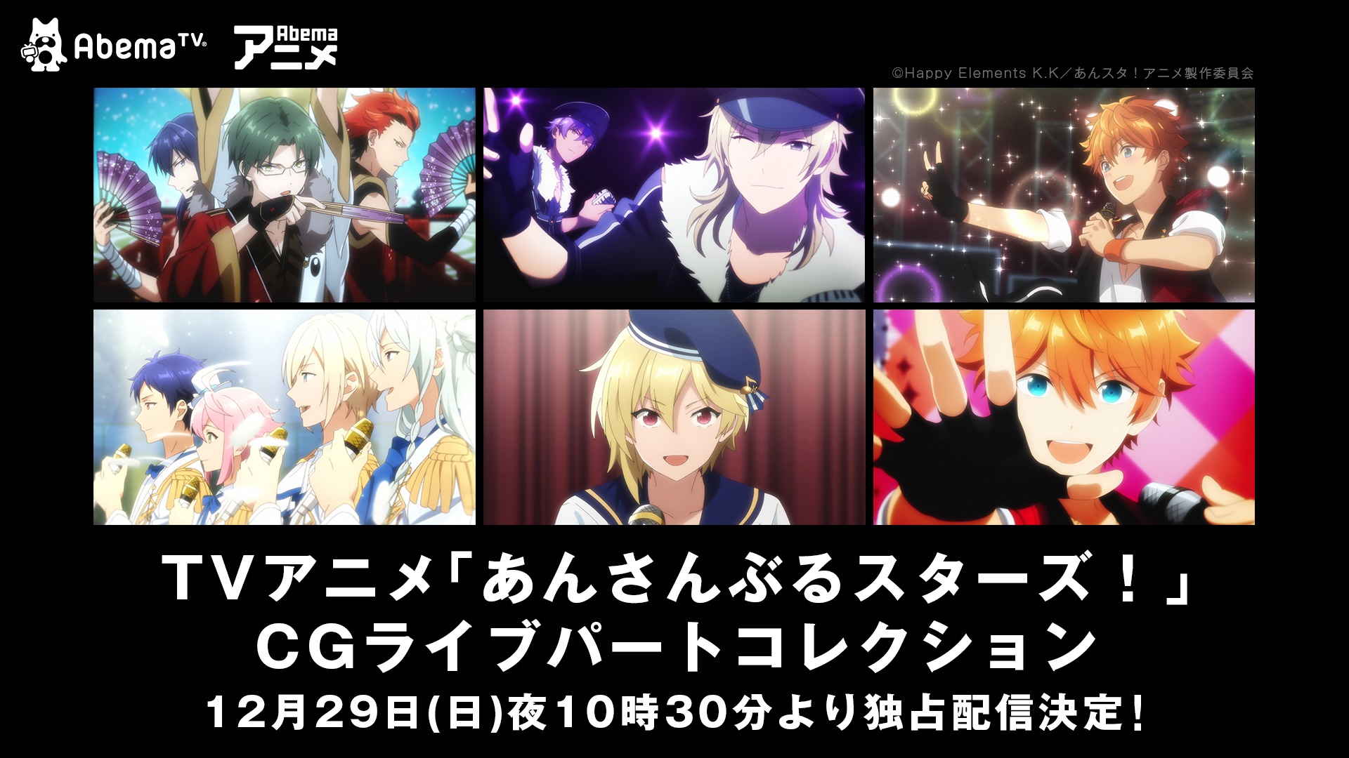 「AbemaTV(アベマティーヴィー)」は「Abema アニメチャンネル」で、12月29日(日)夜10時30分からTVアニメ『あんさんぶるスターズ!』CG ライブパートコレクションを独占配信する。