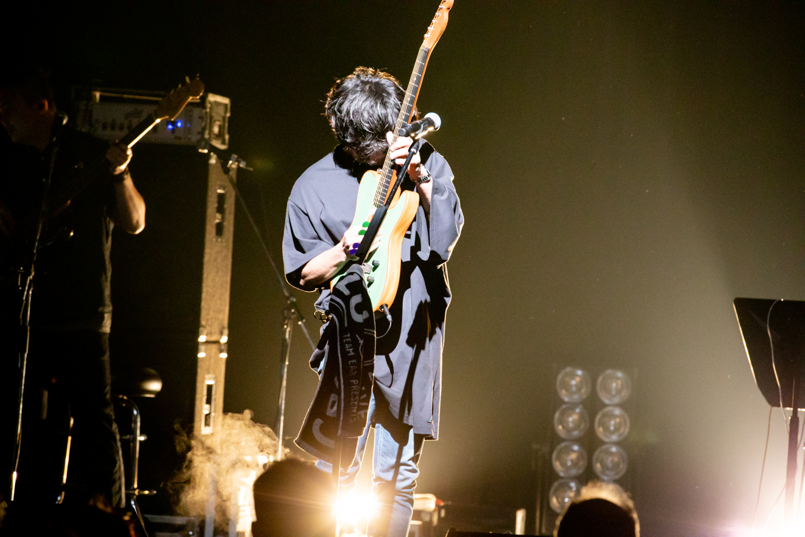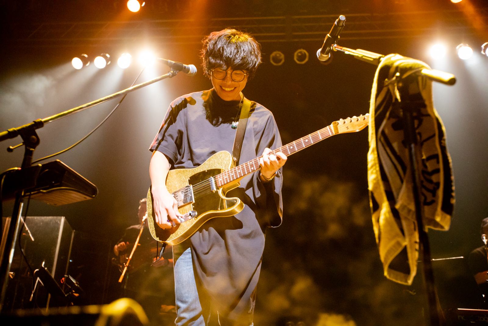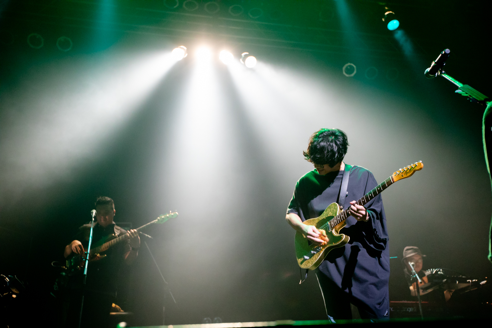 今度はパステルカラーのエレキに変えたクラウドが、自分の足下を覗き込むようにしながら、「フグおいしい。みょうがおいしい。松屋おいしい」と言って歌い始めたのは、「早安晨之美」。昨年の来日公演では重厚感のあるパワフルなアレンジに驚かされたが、今回は原曲に近い爽やかな雰囲気でありつつ、さらなる洗練されたポップスに。