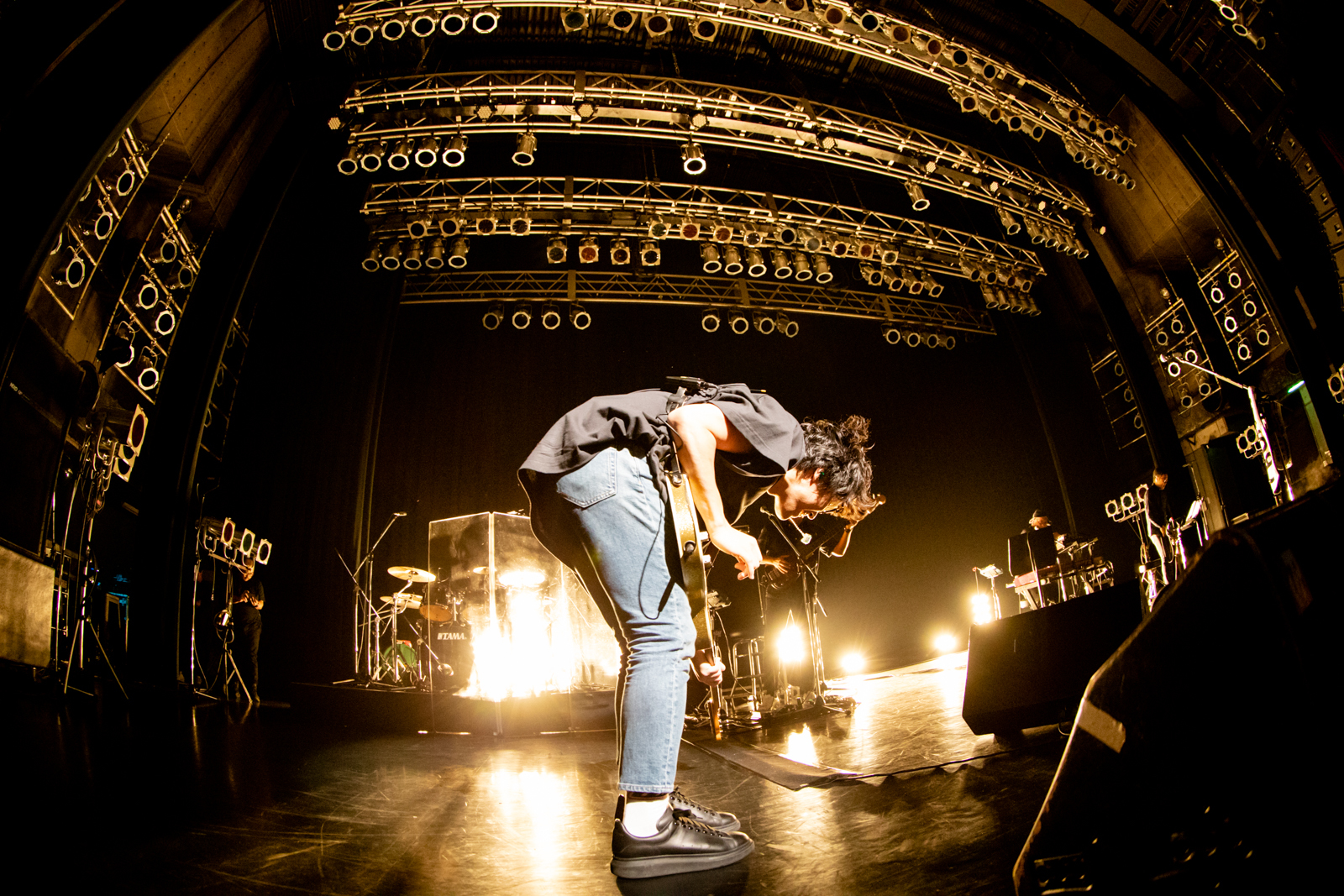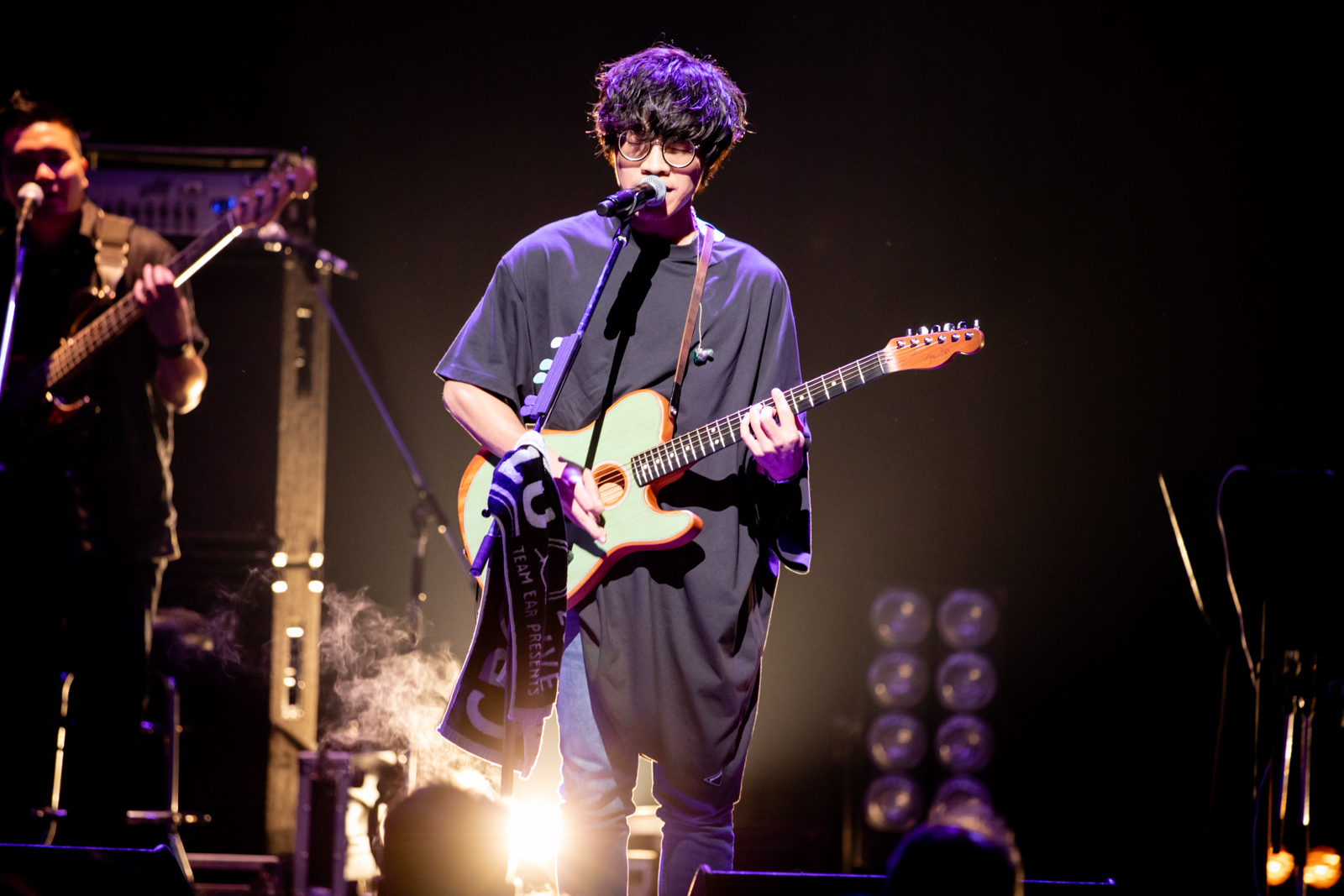 続いて、シンセとトランペットがノスタルジックな「你是我的水」を穏やかに歌い、間奏で中華圏のファンにもメッセージを送った。そして、1コーラス分はピアノ伴奏のみで聴かせる「聽見了嗎」では、気持ちを込めてどんどん調子を上げていくクラウドの伸びやかな歌声が美しく、会場を突き抜けそうなくらいに響きわたっていく。エレキを肩にかけたまま弾かずに、スタンドマイクで歌う姿もまた新鮮。この曲は、台湾でのアリーナ公演では、リフトで高くせり上がり、レーザーをふんだんに用いた大がかりなデジタル電飾の演出で魅了したが(YouTubeにて公式ライブビデオ公開中。必見!)、セットや演出がなくても、彼の歌声だけでその壮大な雰囲気と感動が同じように伝わってくるからすごい。
