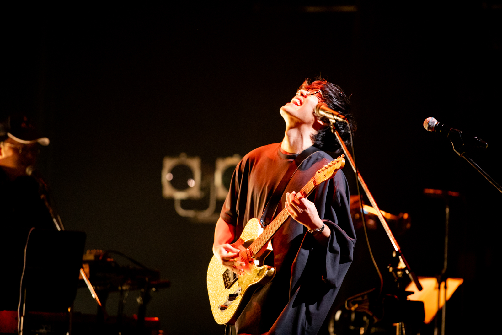 「こんばんは。クラウド・ルーです。お久しぶり!」と滑らかに日本語で挨拶し、「ハロー!アップステア」「ニーハオ!」とだけ言って、アコースティックギターからゴールドのラメのエレキギターに変えて、R&B調にアレンジされた「七天」が始まる。クラウドのギターも、爽やかな原曲からのアレンジも、すべてがエモーショナルだ。