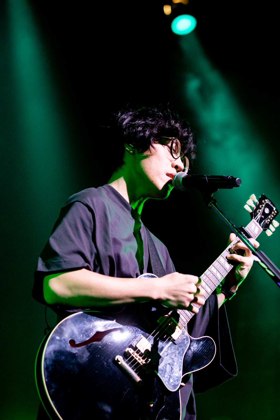 歌い終えて、アコギに変えるちょっとした間を埋めるように「元気?」とボソッとつぶやくと、返ってくる中国語の声にも「ありがと」と日本語で答えるクラウド。イスに腰掛けてアコギで弾き語る「明仔戴」のイントロを弾いただけで、フロアから歓声があがる。歌もギターも繊細で優しく、温かい。そして、座ったままエレキに変えて、メロディアスな楽曲「好想要揮霍」をしっとりと歌い上げた。完璧なファルセットも聴かせ、クラウドの歌の世界にますます引き込まれていく。