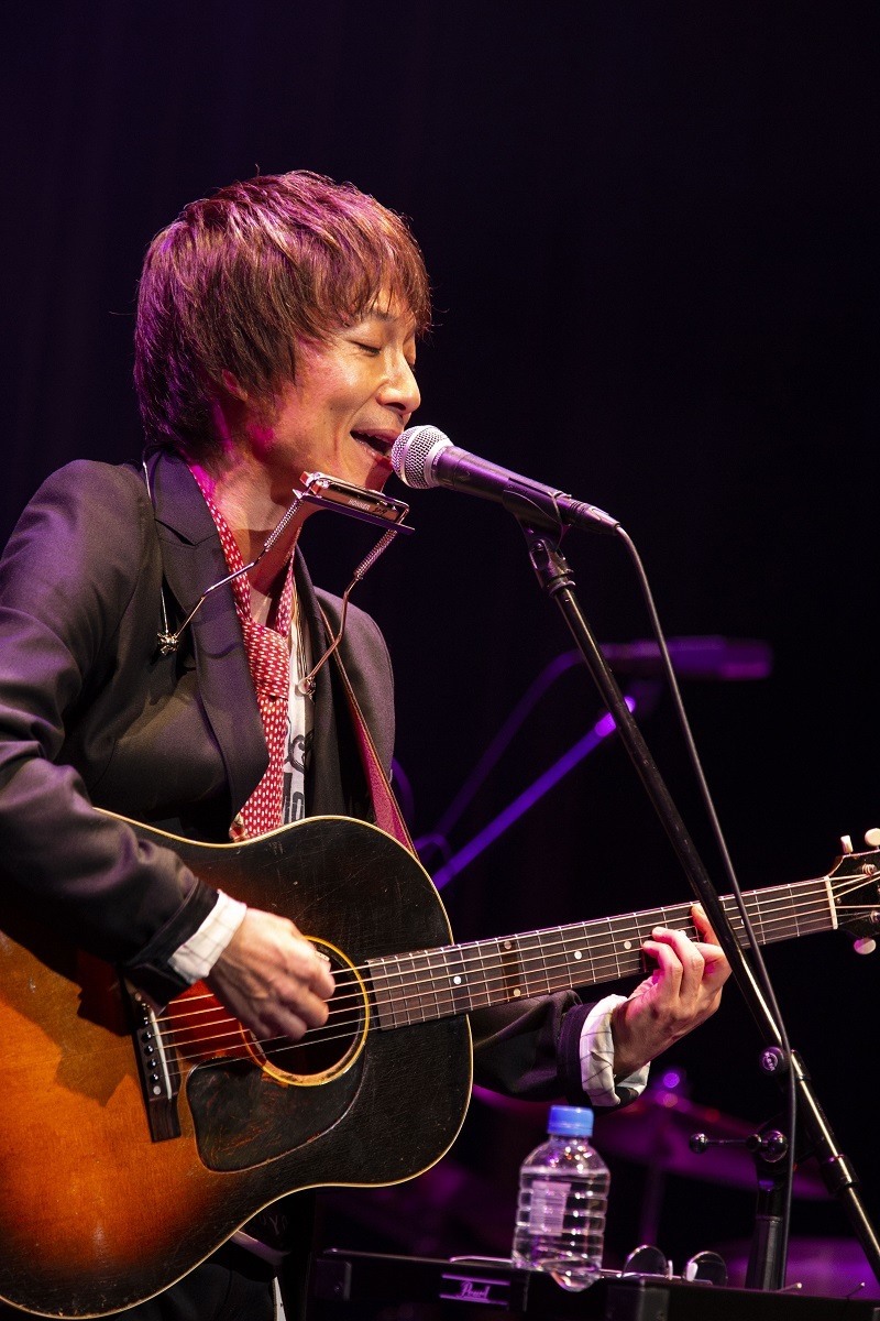 ライブは「全部このままで」から始まった。跳ねるピアノからスタートしたリズミカルな演奏の中を現れた宮田は、ジャケット姿にネクタイを緩く巻き、サングラスという出で立ち。ハーモニカを一節演奏した後、膝とつま先でリズムを取りながら軽やかに歌う。力感をあまり感じさせない、スッとした発声に聴こえるが、歌声の芯は力強い。優しさや切なさなど様々な感情、哀愁までがギュッと込められている。曲が終わると大きく両手を広げて高らかに「サンキューー!」。1stステージから若干のインターバルを置き、絶好調のようだ。