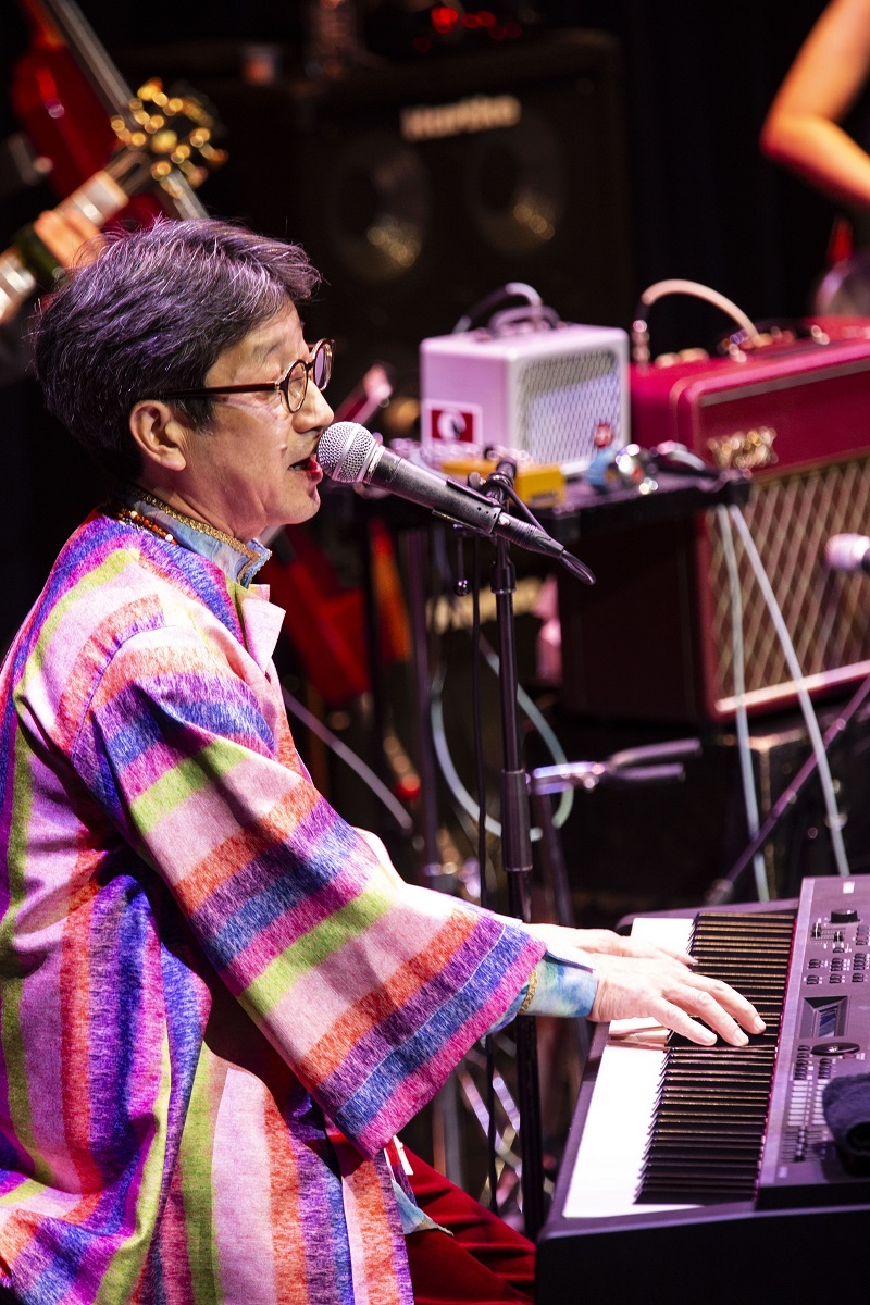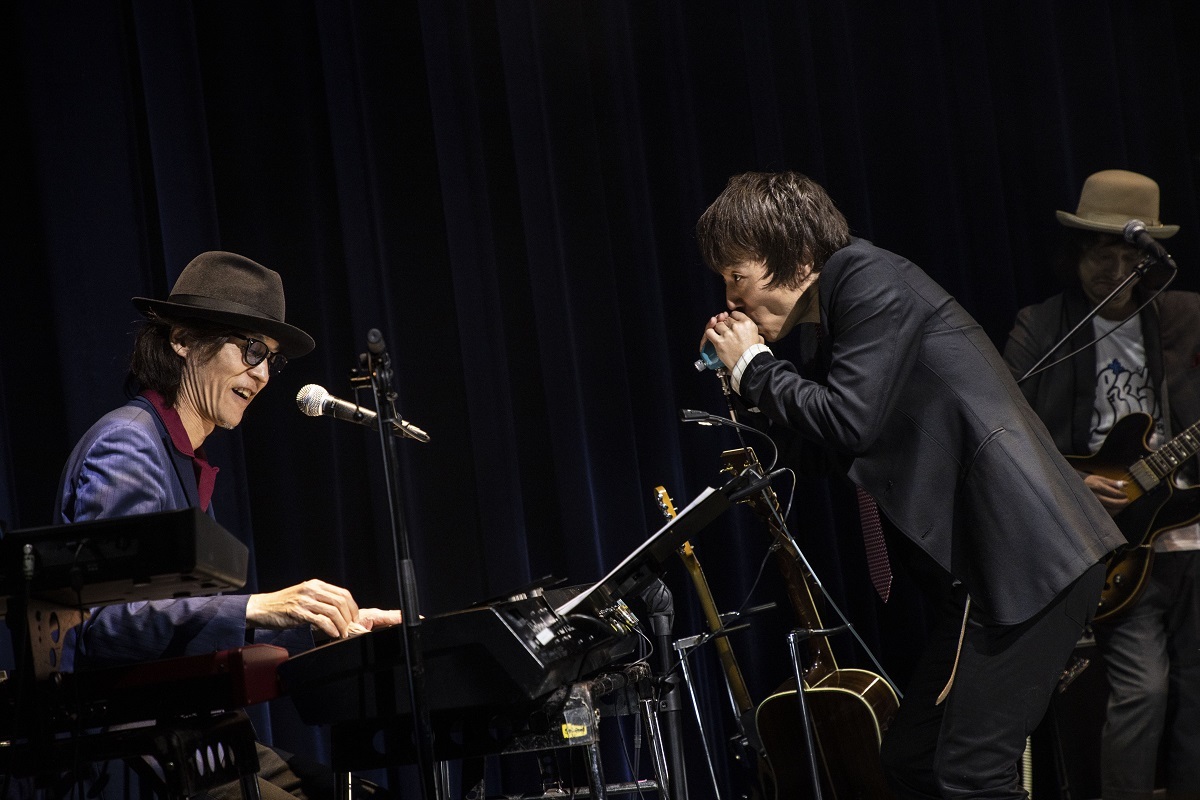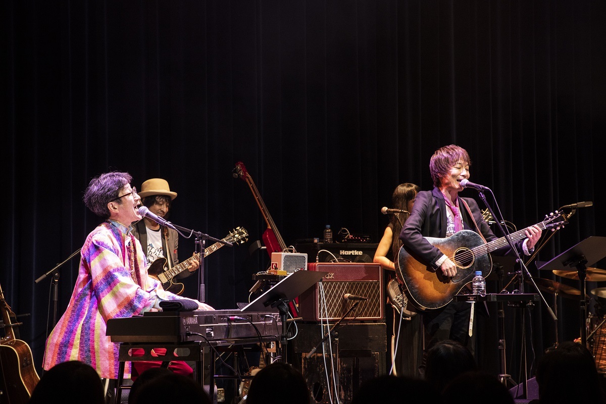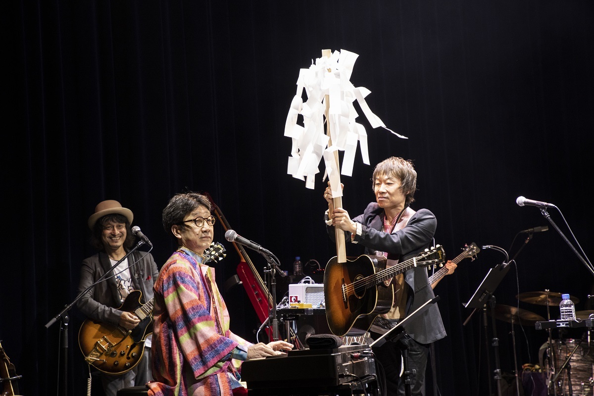ロックンロールのクラシックで、ジョン・レノンもカバーした「Slippin’ and slidin’」を披露したあと、スペシャルゲストを呼び込むと、ヒッピースタイルのカラフルな衣装に身を包んだKANが登場! が、なぜか傍には女性通訳が付いており、英語しかしゃべらないKAN。どうやら、ちょうどこの日が命日であったジョン・レノンが憑依(?)した“KAN・レノン”になっているらしい。そんな状態のKANと宮田がツインボーカルで歌ったのは、ビートルズ「I Am The Walrus」だった。ジョンばりにちょっと鼻にかけてハスキーの発声するKANのボーカル、かなり似ているしとても良い。歌い終わったところで、宮田が大幣(神主さんが振るアレ)で「エイッ」とすると、KANが正気に戻り、先程までの記憶がない……というお約束な小芝居もご愛嬌。もう一曲2人で、と平成のポップス史に輝く「愛は勝つ」を歌い、大盛り上がりとなったのだった。