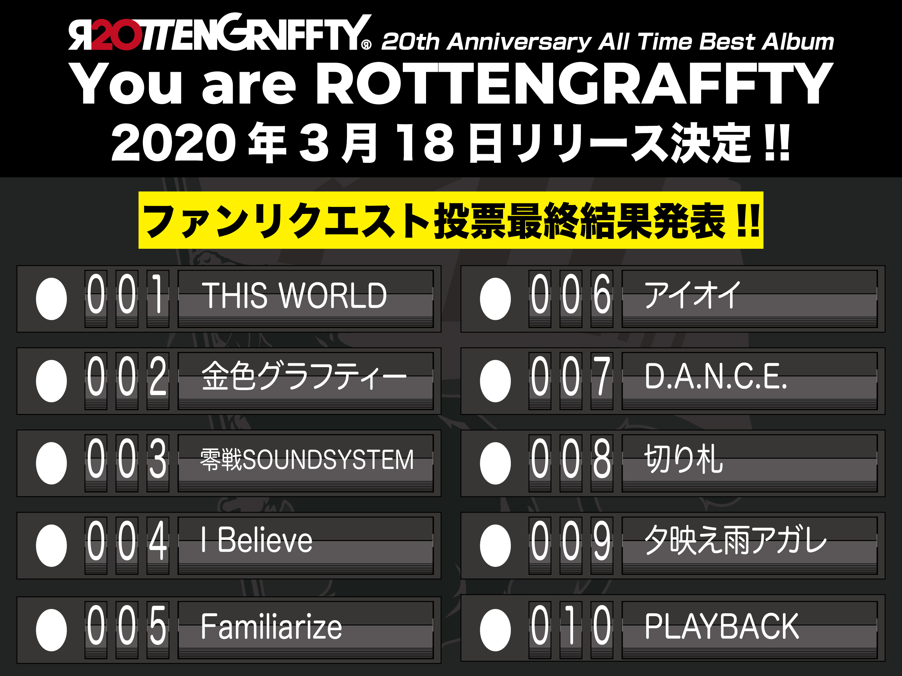 発売日は3月18日、タイトルは『You are ROTTENGRAFFTY』。Disc1はファンリクエスト・ディスク、Disc2にはメンバーセレクト・ディスクという、20周年を締めくくる2枚組オールタイム・ベストアルバムとなる。