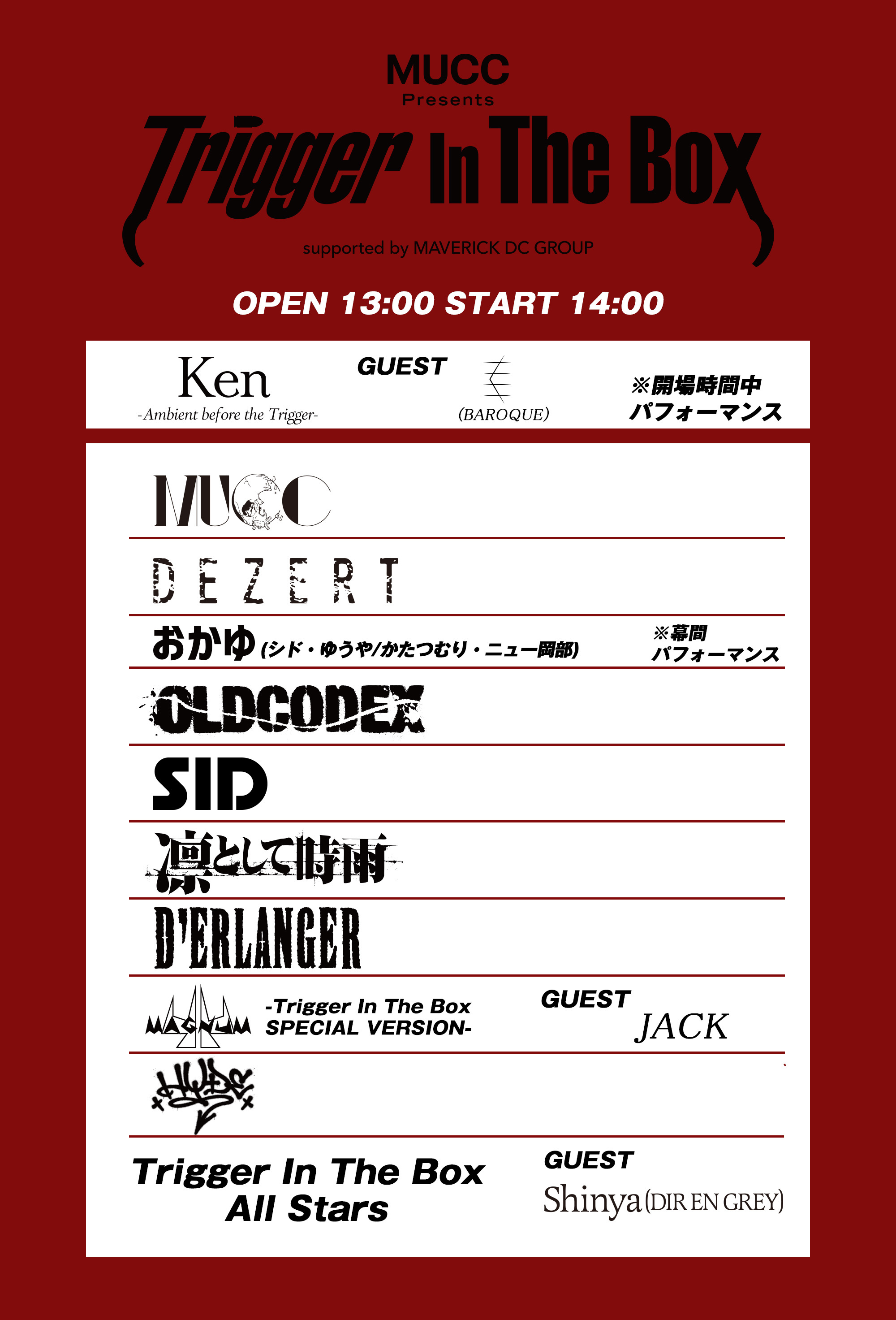タイトル通り、MUCCの“想い”が出演順にも込められ、MUCCがトップバッターとして引き鉄を引き、最後はセッションとして「Trigger In The Box All Stars」が締めくくる。
