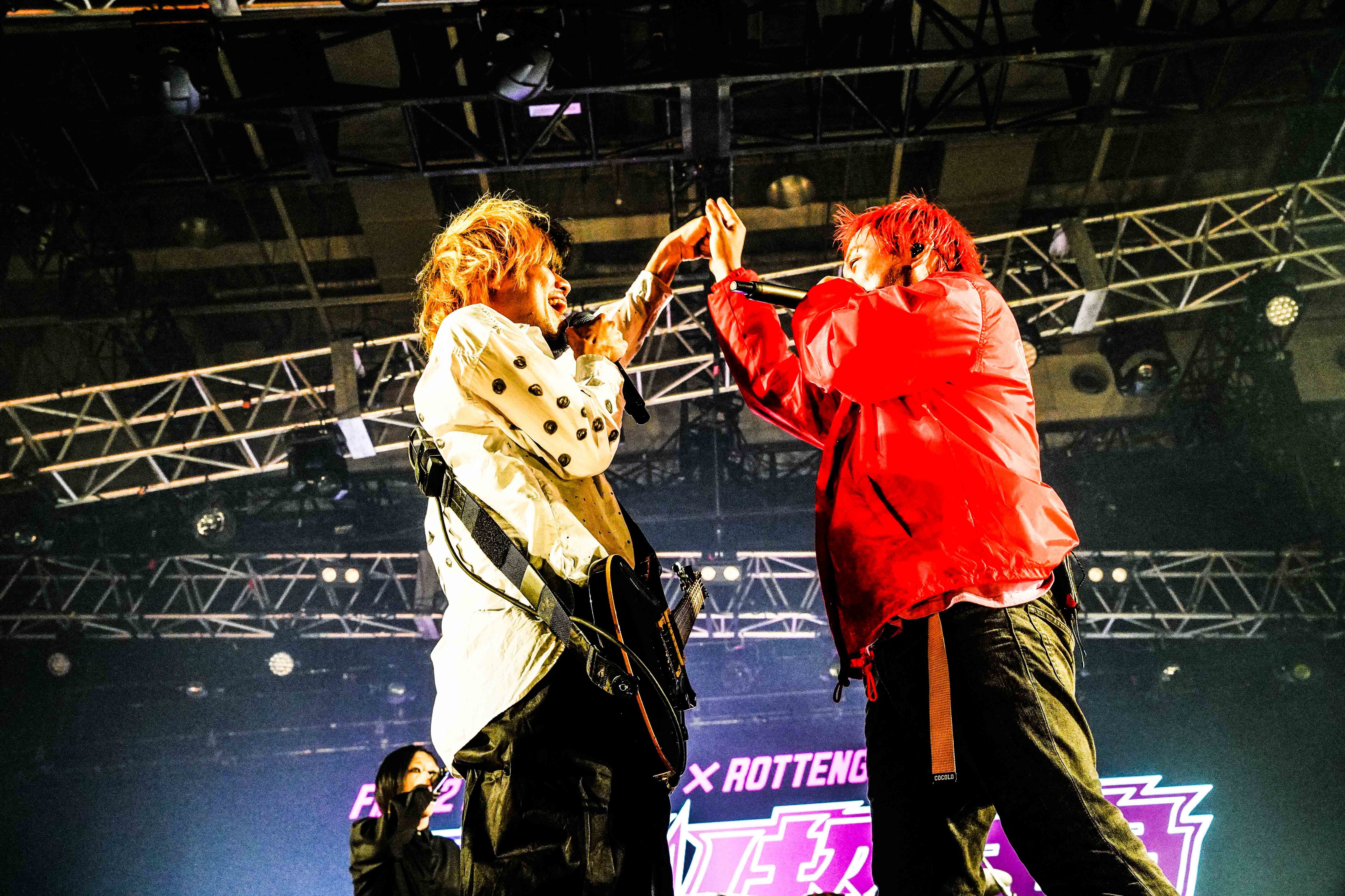 ロットングラフティー主催のフェス『ポルノ超特急』がまさかの『レディクレ』出演! 前段の10-FEETも続投したものの、「10-FEETはロットングラフティーのメンバーを完コピしたんですよね(笑)」(鬼頭)、「でもコウイチさん(10-FEET/Dr)だけ、不審なカメラマンのおじさんみたいな、頭にバンダナ巻いてな」(飯室)と早業でのメイク&コスプレを披露したとか。
