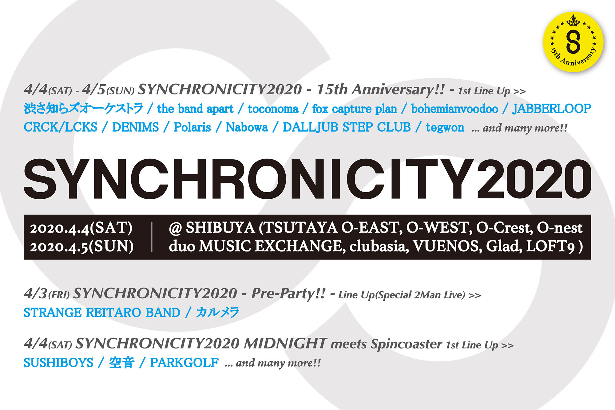 2020年4月3日(金)~4月5日(日)に東京・渋谷にて開催される都市型フェスティバル『SYNCHRONICITY2020 – 15th Anniversary!! -』の第1弾ラインナップが発表となった。