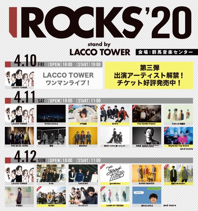 LACCO TOWER / ircle / KAKASHI / goodtimes / SUPER BEAVER / 高高-takataka- / 中田裕二 / NUBO / ラックライフ / LAMP IN TERREN / 忘れらんねえよ / and more