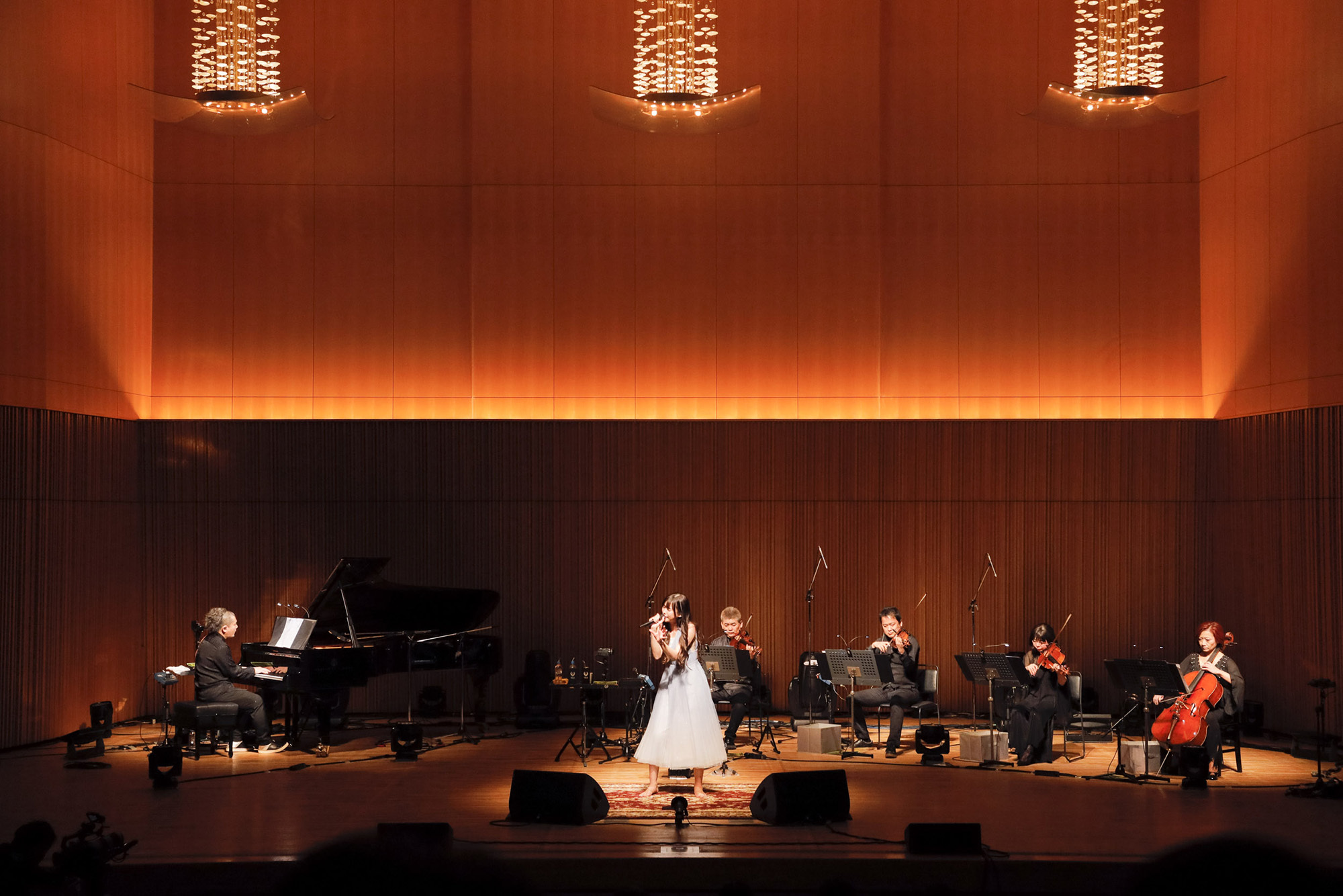 やがて登壇したのはピアノ・櫻田泰啓、1stヴァイオリン・押鐘貴之、2ndヴァイオリン・山本大将、ヴィオラ・渡部安見子、チェロ・笠原あやの、の計5名の伴奏者たち。そして主役のTRUEは、透明感のあるシルバーのワンピース姿に、なんと裸足でステージ中央のカーペットに立った。
