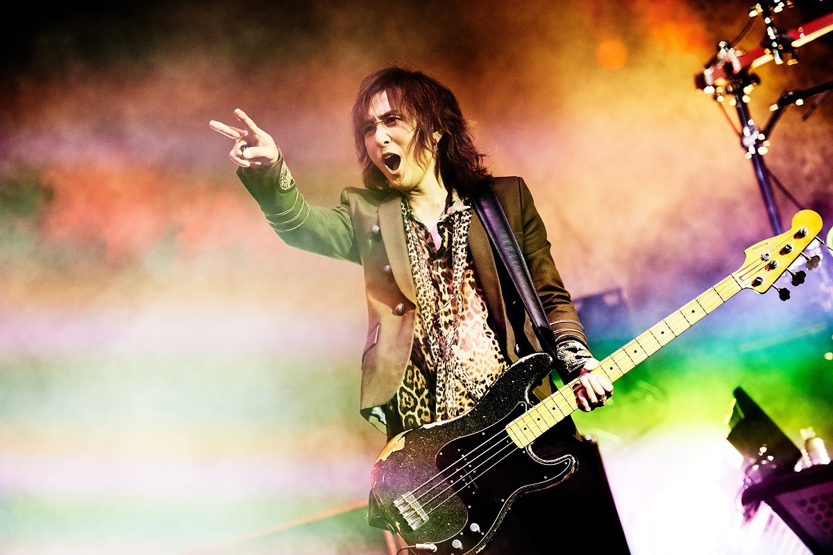 そこから、本編最後、「TONIGHT」でその光を“君”だけのものへと落とし込んでいくと、さいたまスーパーアリーナはまさにライブハウスのような一体感ある熱狂に包まれていったのだった。RYUICHIの前に跪いてストロークを奏でていたINORAN、続けてすれ違ったJ、それぞれを労うように肩にポンポンと触れていったSUGIZOは、曲のエンディング、ペットボトルを客席に投げ入れ。Jはベースにキスしたあと、それをライフル銃のように構えて感謝の気持ちを場内に打ち込む真似をした。