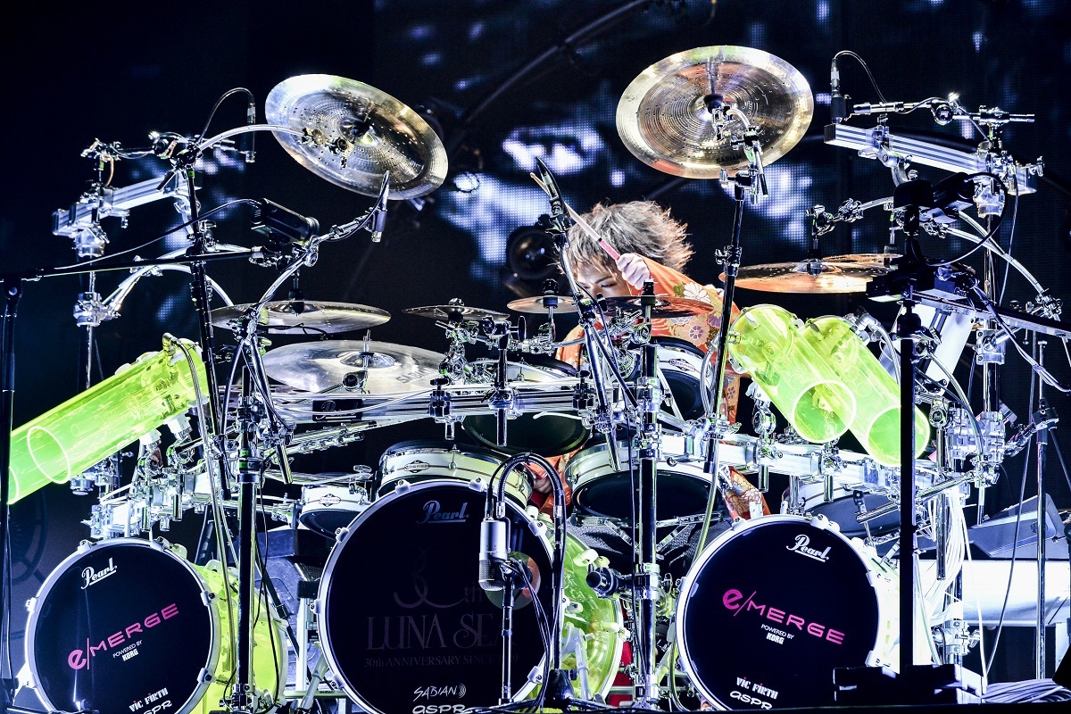 この時点で、彼らは自分たちがすでに前とは違うモードにシフトチェンジしていることを明確にアピールしていく。それに合わせて、真矢はインストゥルメントの部分で発売前のPerlの電子ドラム“e/MERGE”を今回のライブから使用することで、アリーナでもダイナミックかつ、クリアな音を叩き出す。Jはいまから考えると、こうなることを予想していたかのように30周年からフェンダーとタッグを組み、自分のベースの新しい可能性を探っていた。また、SUGIZOはこの日、自前の燃料電池車(および周辺機器)で電力を提供し、このライブ自体も、出演者が自力で電気をまかなうというLUNA SEAのサスティナビリティへの取り組みを表したものにもなっていた。