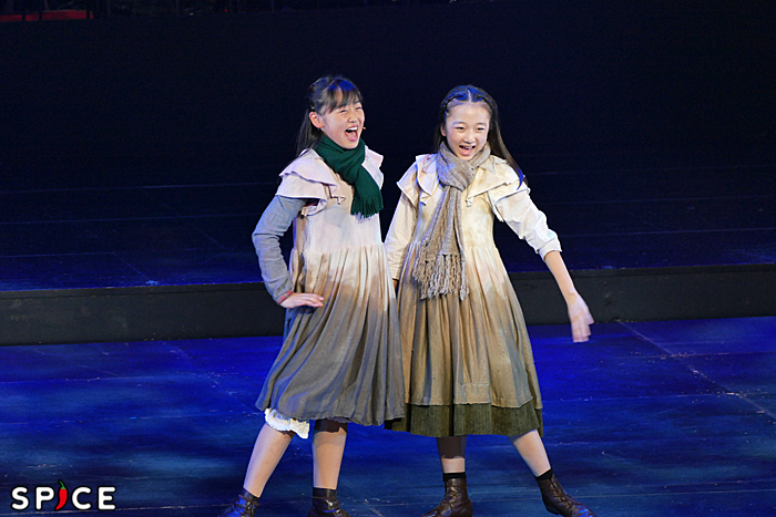 両親はもういない、とわかっている孤児たちが、その中で最大限の願いを唱える。4人のアニーたち(2018年アニー 新井夢乃・宮城弥榮、2019年アニー 岡 菜々子・山﨑玲奈)が、「家族」への憧れが詰まった「メイビー(Maybe)」をアカペラで歌い上げる(冒頭写真)。その想いを支えるように、孤児たちが後半にコーラスで加わる。