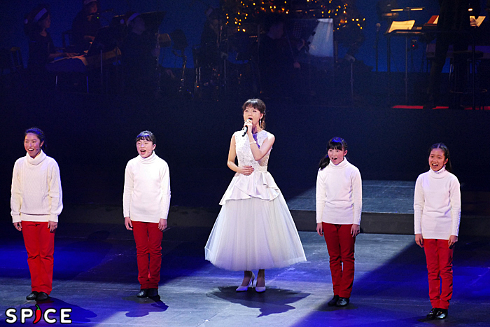 すると舞台上に、光の精のように、きらめく純白のドレスに身を包んだ木村が現れた。「O Holy Night」で、天にも届きそうな木村のソプラノが響き渡り、4人のアニーも厳かにコーラスで加わる。ヴァイオリンのソロがしみじみ美しい。
