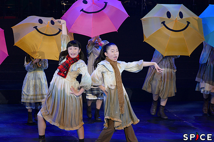ヒップホップ調のリズムに乗せた「ダンサブル・トゥモロー(Tomorrow)」で開幕した2019年クリコン。2018年アニー&アニーズ、2019年アニー&アニーズ、オーケストラが紹介された。カラフルな掃除道具での「ハードノックライフ(It's The Hard-Knock Life)」では、モリー3人(尾上 凜・三浦あかり・石井瑠菜)がバケツを太鼓に見立ててリズムをとる姿が、何とも可愛らしい。