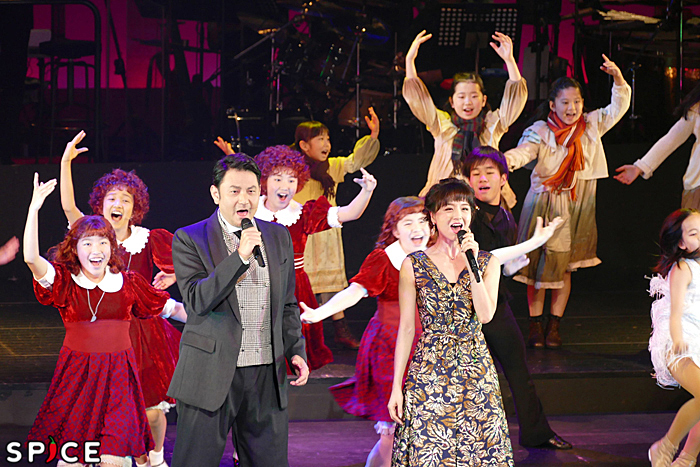 「2017年からウォーバックス役を演じ、すっかり『アニー』が板についた藤本隆宏様が、ニューヨークへの熱い思いを歌います」とマルシアに紹介されて歌われたのが、藤本リードボーカルによる「N.Y.C.」。本編でこの曲は、ウォーバックスが秘書グレースとともにアニーを映画に連れ出す際に歌われる。2018年ダンスキッズがトレンチコート姿でニューヨークの住人を装う様は、まるで映画のワンシーンのよう。『アニー』の舞台は1933年で、ちょうどその頃、トレンチコートは男性の冬の定番ファッションになったといわれ、当時の空気感も楽しむことができる。そしてグレースのパートでは、2015年・2016年にグレース役を演じた木村花代が登場し、美しいソプラノを響かせた。2019年のダンスキッズも加わり、本編同様の衣裳に転じて華を添えたかと思えば、さらに孤児たちも加わって、ニューヨークの賑わいがシアトリカルに表現される。そこへ4人のアニーが順々に「未来のスター」のソロ部分を担当し、ニューヨークという街が持つ煌めきを際立たせた。