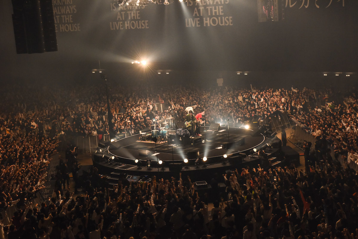 序盤の暴れ馬みたいな勢いから一転、会場の空気が変わったのは、幻のような恋をロマンチックに歌い上げた「星世界航行曲」、続けて披露された「ウルトラマリン」と「Mayday」からだろう。広大な宇宙や、悠久の時の流れに比べれば、いま自分の心の大部分を埋め尽くす狂おしい感情もちっぽけで儚いものかもしれない。そういう切なさ、弱さ、人間臭さを、体まるごとぶつけて表現する橋本のボーカルの訴求力がすさまじかった。会場を真っ赤に染めた渾身のバラード「ラブソング」の頃には、それまでダイブしたり、拳をあげたり、その演奏に身を委ねていた会場のお客さんは微動だにせず立ち尽くしていた。この日の幕張メッセには、スクリーンやレーザーのような派手な演出はなかったが、ただ、関、須藤、小松が鳴らす音と、橋本の歌さえあれば、それで十分だった。