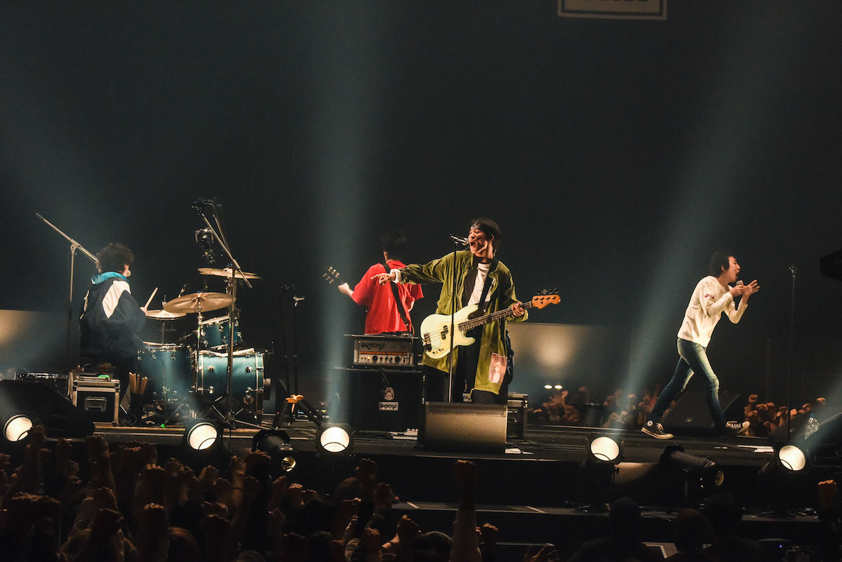橋本のアコースティックギターの弾き語りによる「これさえあればいい」からはじまったアンコールは、本編以上に自由だった。1曲を終えて、「じゃあ、ばいばい!」とおもむろにステージを降りようとする橋本に、フロアから「えー!?」と猛抗議する声が湧くと、「ワンモアだって(笑)」とメンバーを呼び込む。お客さんから寄せ書きのフラッグを受け取り、橋本が姉の結婚式のときに作った曲と紹介した「みどり」、さらに、この日5度目(!)の「ファイト!!」を披露したところで、終演……かと思いきや、再びステージに戻るメンバー。「終電とかあるやつ帰っていいよ、これ趣味だから(笑)」と言いつつ、そこから、「俺達が呼んでいる」にはじまり、「Tough to be a Hugh」「フュージョン」「エース」など、かれこれアンコールを6回ぐらい繰り返し、「社長に、“もう終わろう”って言われた(笑)」ということで、最後に、バンド編成による「これさえあればいい」で、ライブを締めくくった。