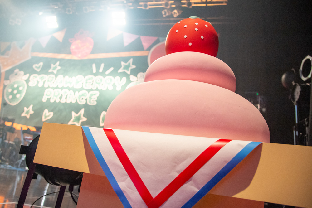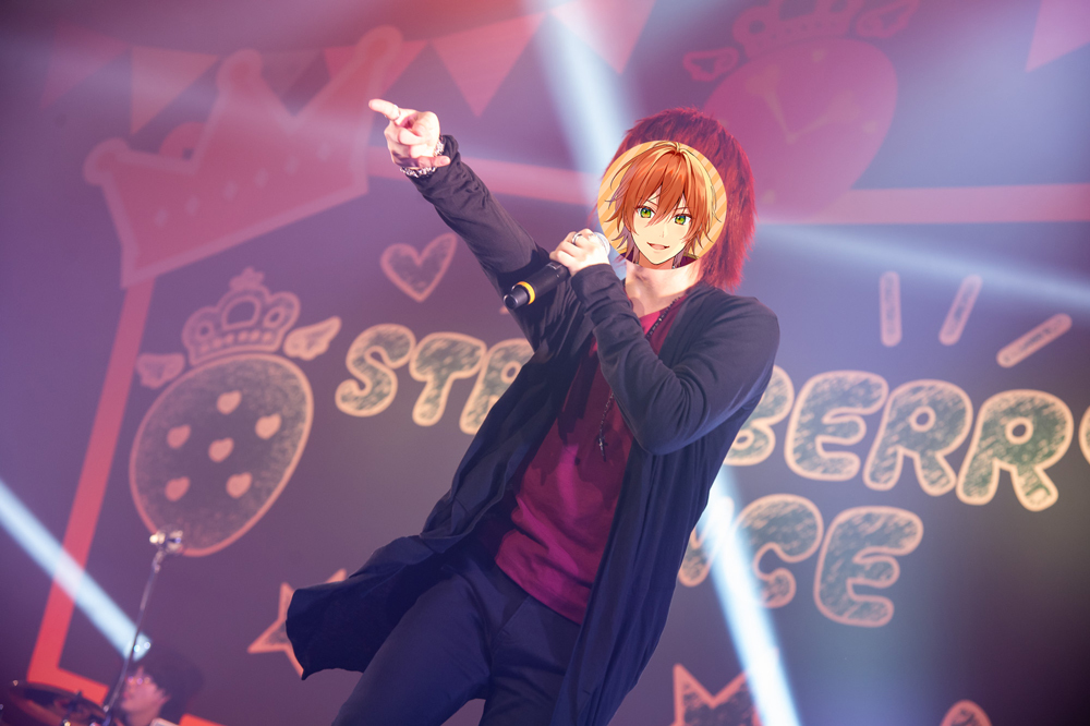お正月らしく、ステージ両脇にはイチゴが載った立派な鏡餅オブジェが飾られ、後方には黒板に描かれた風の大きな“STRAWBERRY PRINCE”の文字やかわいらしいイチゴのイラストが。1階&2階ともにぎっしり詰まったオーディエンスが待ちかねる中、黒いパンツに黒いロングカーディガンを合わせたラフな衣装でジェルが登場すると、1曲目は「虎視眈々」だ。地元・関西での開催に彼自身の期待感も高まっているのだろう、「大阪、盛り上がっていけるか!」と笑顔を見せ、ジェルのイメージカラーであるオレンジのペンライトが揺れるフロアにマイクを向けたり、前方の観客が差し伸べる手にタッチしたり。艶っぽい“ジェルボイス”が一段と映える「クイーンオブハート」では、ひざをついてオーディエンスの目線に合わせようとしたりもして、大歓声が上がる。