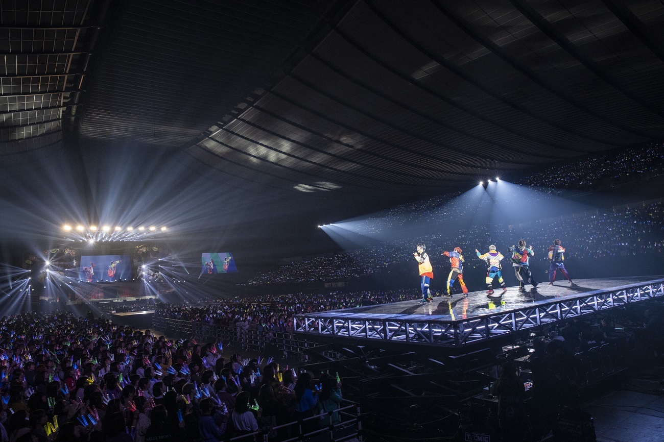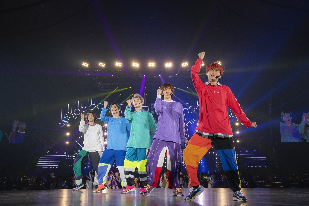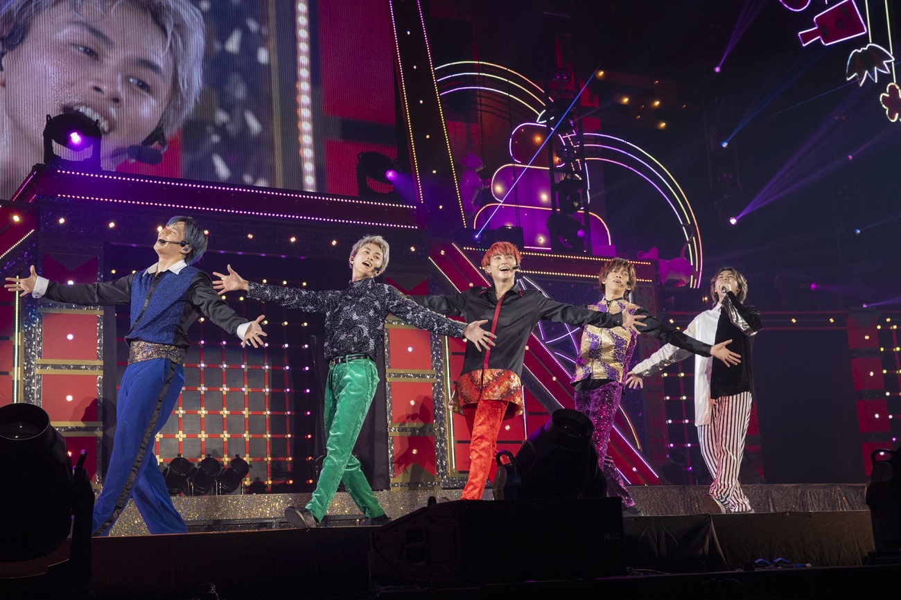 さらに中盤では、メンバー中4人が25歳を迎えた“今”だからこそのパフォーマンスで8号車を魅了。タイトルの通り、星空に浮かぶ月をバックに絶妙な間合いのダンスでセクシーなムードを漂わせる「Full Moon」が夜の空気を醸したところで、初披露されたのが最新シングルのカップリング曲「Body Rock」だ。上空を貫くレーザーとスモークのなか、初の全英詞曲を得意のファルセットも交えて強弱豊かに届けるタカシのボーカルと、椅子にもたれて身体を艶めかしく波打たせるダンスは、歴代の楽曲の中でも群を抜いて妖艶で、ペンライトの動きを止めて見入る客席からは大きな悲鳴が。加えて、今年の抱負や8号車への想いを書き初めで発表する日替わり映像を挟んでは、この東京公演3デイズのテーマ曲「On & On」もお披露目された。ラグジュアリーなサウンドに乗せ、テンポよく繰り出されるシンクロ率の高いダンスと堂々たるタカシのボーカルからは、“唯一無二の道を往くのだ”という静かな闘志がうかがえて、未来への決意にあふれた強気なリリックを彼ら自身のリアルな心情として投影。初披露2曲のスタイリッシュでキレのあるパフォーマンスが、彼らのアーティストとしての進化を明らかに証明する。そこからアリーナ最後方のムービングステージにトロッコで高速移動すれば、ファンクにノリよく「Hey Hey Hey」を、そしてジャズアレンジの「STYLE」を久々にライブ披露。前方へと動き出したステージ上でマイクスタンドを軽やかに操る姿といい、自然体でフェイクを利かせるタカシのボーカルといい、大人びたジャンルの楽曲も背伸びすることなく、等身大で楽しんでいる“今”の彼らは実に頼もしい。