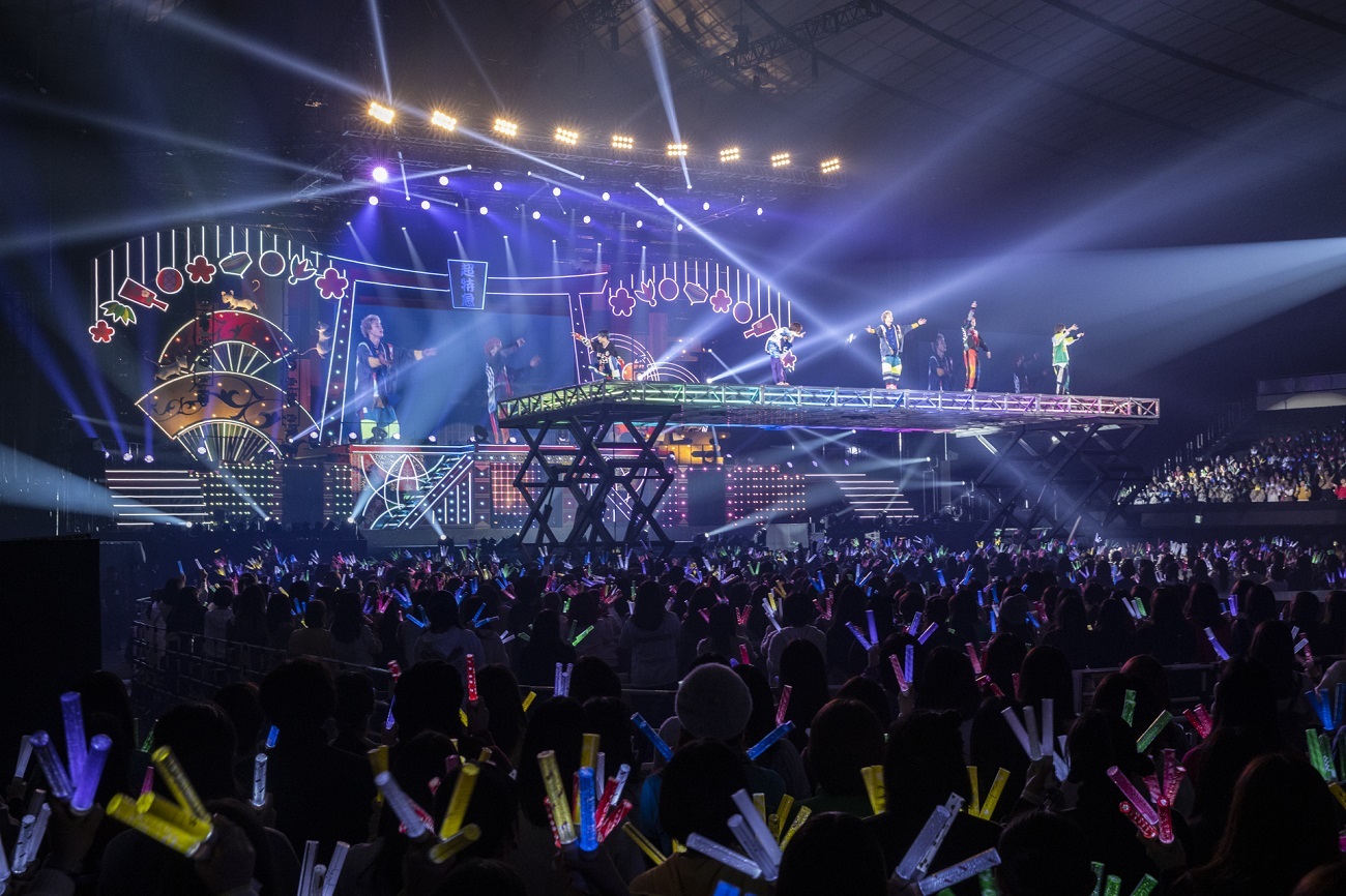 今回のアリーナツアーも全5公演すべてのチケットが即日完売。耐震改修工事を終えて営業再開したばかりの本会場で超特急がライブをするのは3年ぶり3回目だが、3デイズは初めてにもかかわらず、スタンド席の端の端まで各日8号車に埋め尽くされた。高まる熱気のなか、書き初めされた“超特急”の文字が躍り、袴姿のメンバーが舞うオープニング映像を映した紗幕が落ちると、ステージ上にはそれぞれイメージカラーに和柄の入った煌びやかなセットアップ姿のメンバーが。そして”超特急”と記された扁額を掲げた鳥居の中央に立ち、ユーキが「新年あけましておめでとうございます。みんな、今日は最高の1日にしようぜ!」と宣言するや、鼓や尺八の音で和風アレンジされた「SAY NO」でライブを幕開ける。鏡餅や扇、独楽や羽根つきといったお正月アイテムがネオンに輝き、今年の干支にちなんで6匹のねずみが鎮座するステージで、ド頭から火花がスパークする華々しいオープニングに8号車は熱狂。メンバーもタフなアッパーチューンで息の合ったダンスを見せながら、「あけおめ!」と飛び跳ねたり、「ねずみ年!ちゅっちゅちゅ~」とコールを変えたりと、全身でお正月感を醸し出してゆく。続いてドロップされた「Don’t Stop 恋」のハチャメチャ&ナンセンスなダンスも、次々にネオンの色を変えるド派手なステージと相性ピッタリ。喜怒哀楽の感情を目まぐるしく変化させながら、遊びの利いたタカシのボーカルと共に新年の喜びを伝えてくれる。