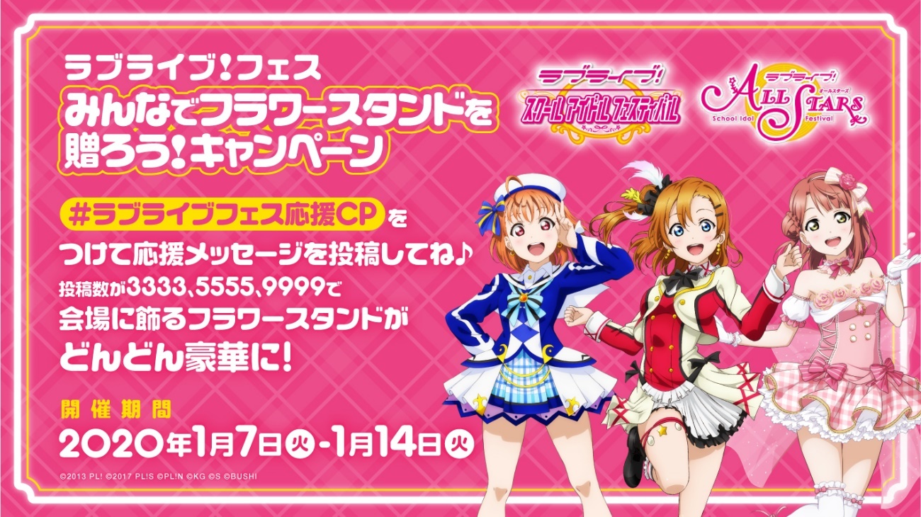 スマートフォン向けアプリ『ラブライブ!スクールアイドルフェスティバルALL STARS』及び、 配信中のアプリ『ラブライブ!スクールアイドルフェスティバル』で、「ラブライブ!フェス みんなでフラワースタンドを贈ろう!キャンペーン」を開催することが決定した。