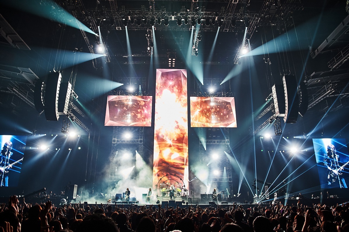 中盤の流れも絶妙だった。『LUNACY』(2000年)の「Sweetest Coma Again」は終幕前の楽曲ながら、「世界基準のLUNA SEAのサウンド」と『CROSS』に触れたRYUICHIのMCの直後に耳にすると、また捉え方が変わってくる。19年も前のマテリアルが本来的な魅力をさらに表出させた、そんなグルーヴだった。それゆえに次の「BEYOND THE TIME ~メビウスの宇宙を超えて~」「悲壮美」で描かれるサウンドスケープが、音源以上の広大な空間へとオーディエンスを誘う。加えて、その素晴らしさすら序奏に思えてしまったほど、「闇火」の劇的さには引き込まれた。INORANのアコースティックギター、SUGIZOのヴァイオリンによる調べから、情念を映し出すかのように歌い上げていくRYUICHI。内面にジワジワと浸透してくる荘厳な物語の中にいつまでも佇んでいたい、そんな思いに駆られた人も少なくなかったはずだ。