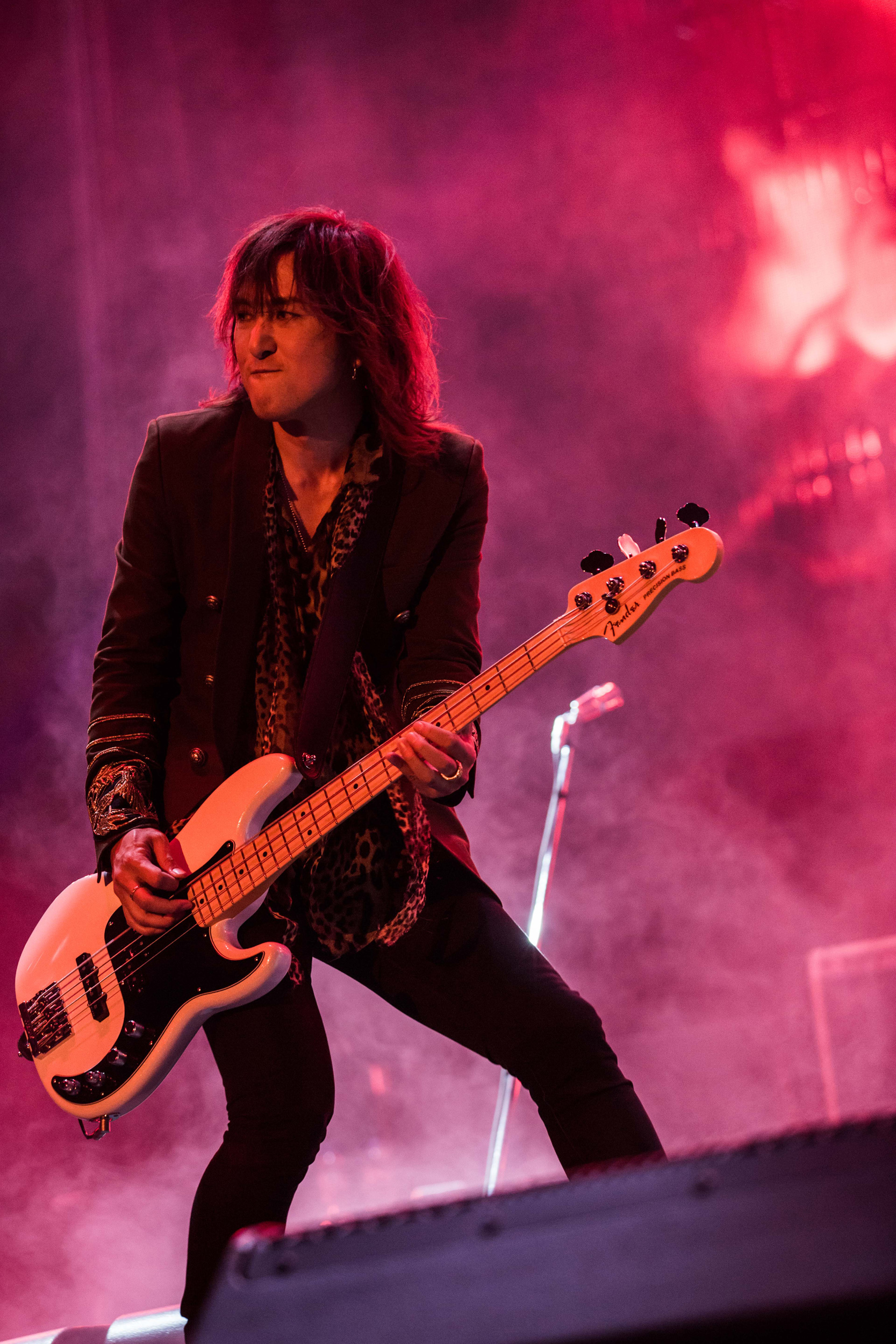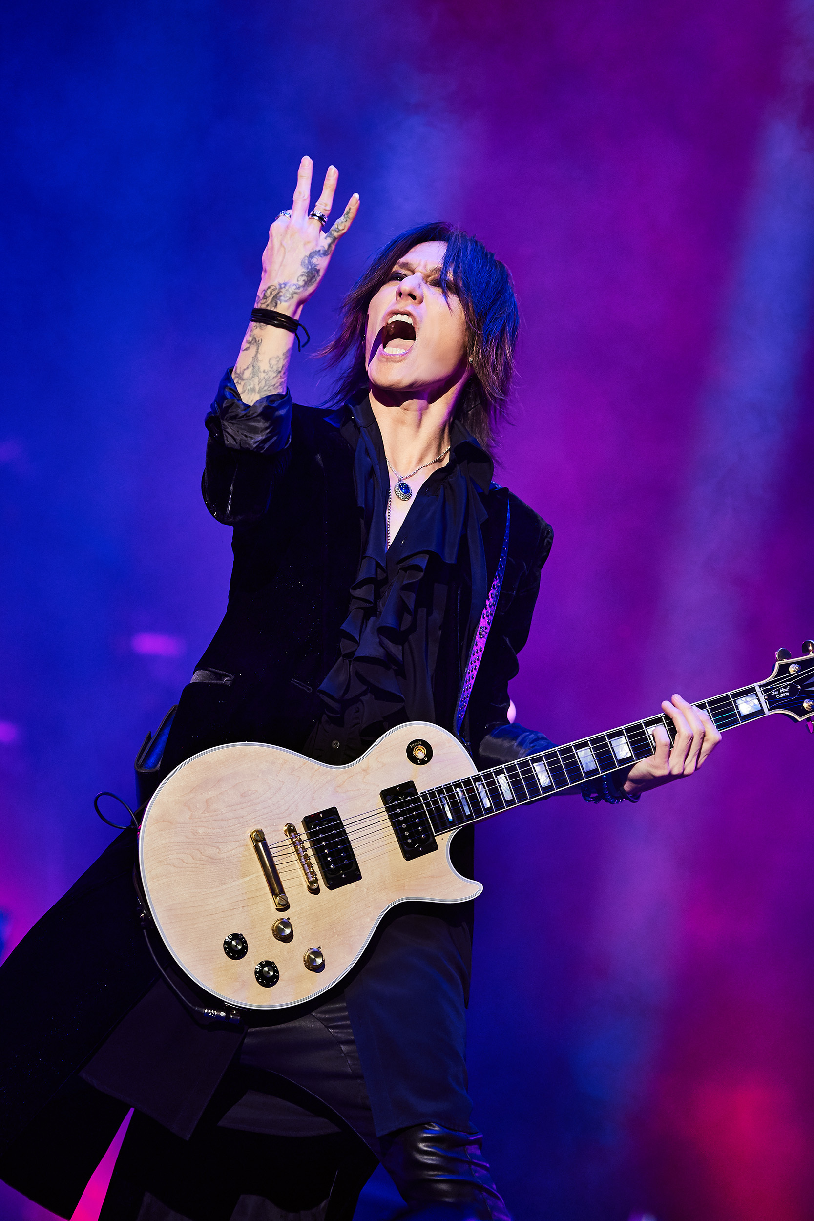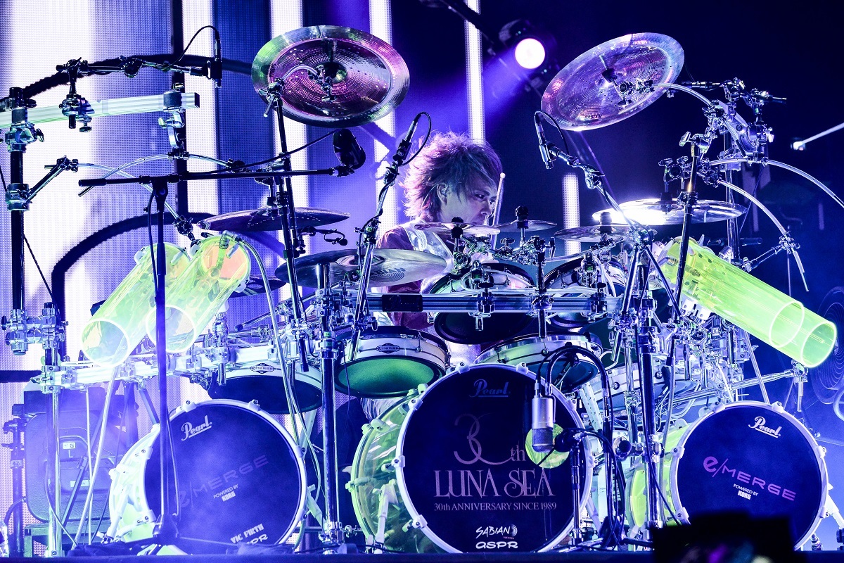 新たに開発された電子ドラム「e/MERGE」を操る真矢のドラムソロも見どころで圧巻だった。裃姿の笛、鼓奏者を迎えての五人囃子。こういったコラボレーションはこれまでも取り組まれてはきたが、あたかも真矢がシテであるかのような名演は、能をルーツに持つ彼が務めるからこそ意味がある。その熱をJのベースソロが引き継ぐ。LUNA SEAのオーセンティックなロック感を彼のプレイが担っているのは周知の事実だろう。「30周年だぜ! とことんいこうか!」と笑顔を向けながら、「このまま次の曲をコールさせてもらいます」と「JESUS」のタイトルを高らかに叫ぶ。予想外の展開に客席は瞬時に沸いた。このお馴染みの楽曲が醸し出すある種の邪悪さは、この時代ならではの特性だろう。