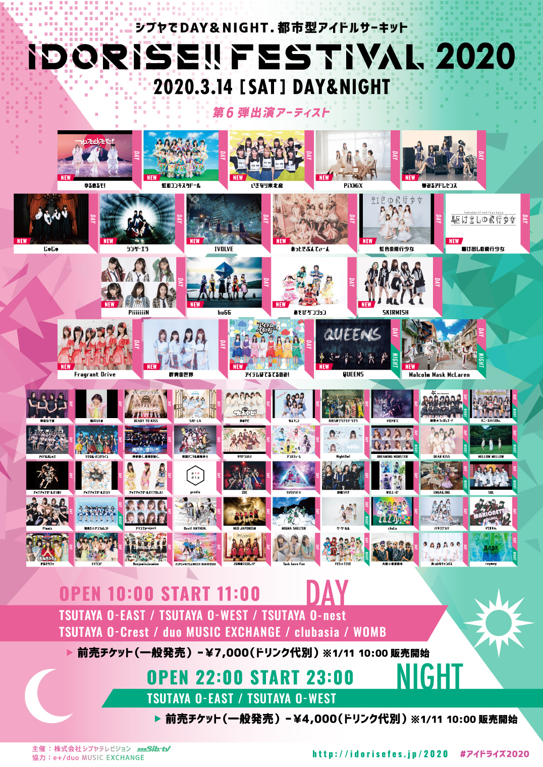 『IDORISE!! FESTIVAL 2020』はシブヤテレビジョンが主催するイベントで、DAYとNIGHTの2部構成。今回DAY公演の出演者として、ゆるめるモ!、虹のコンキスタドール、いぎなり東北産、PiXMiX、夢みるアドレセンス、じゅじゅ、シンダーエラ、IVOLVE、あっとせぶんてぃーん、虹色の飛行少女、駆け出しの飛行少女、PiiiiiiiN、buGG、あそびダンジョン、SKIRMISH、Fragrant Drive、群青の世界、アイテムはてるてるのみ!、QUEENS、Malcolm Mask McLarenの20組が発表された。このうちQUEENS、Malcolm Mask McLarenはNIGHT公演にも出演。出演者は今後も追加されるとのこと。