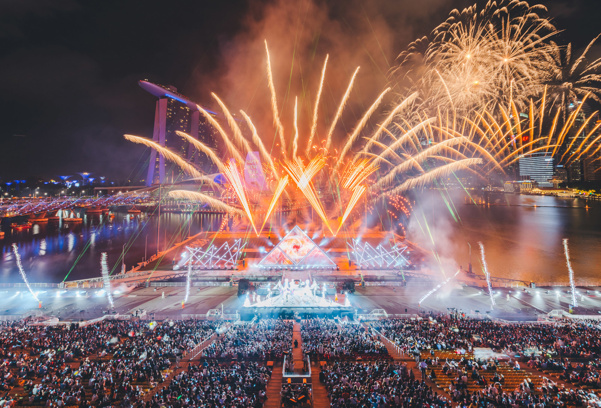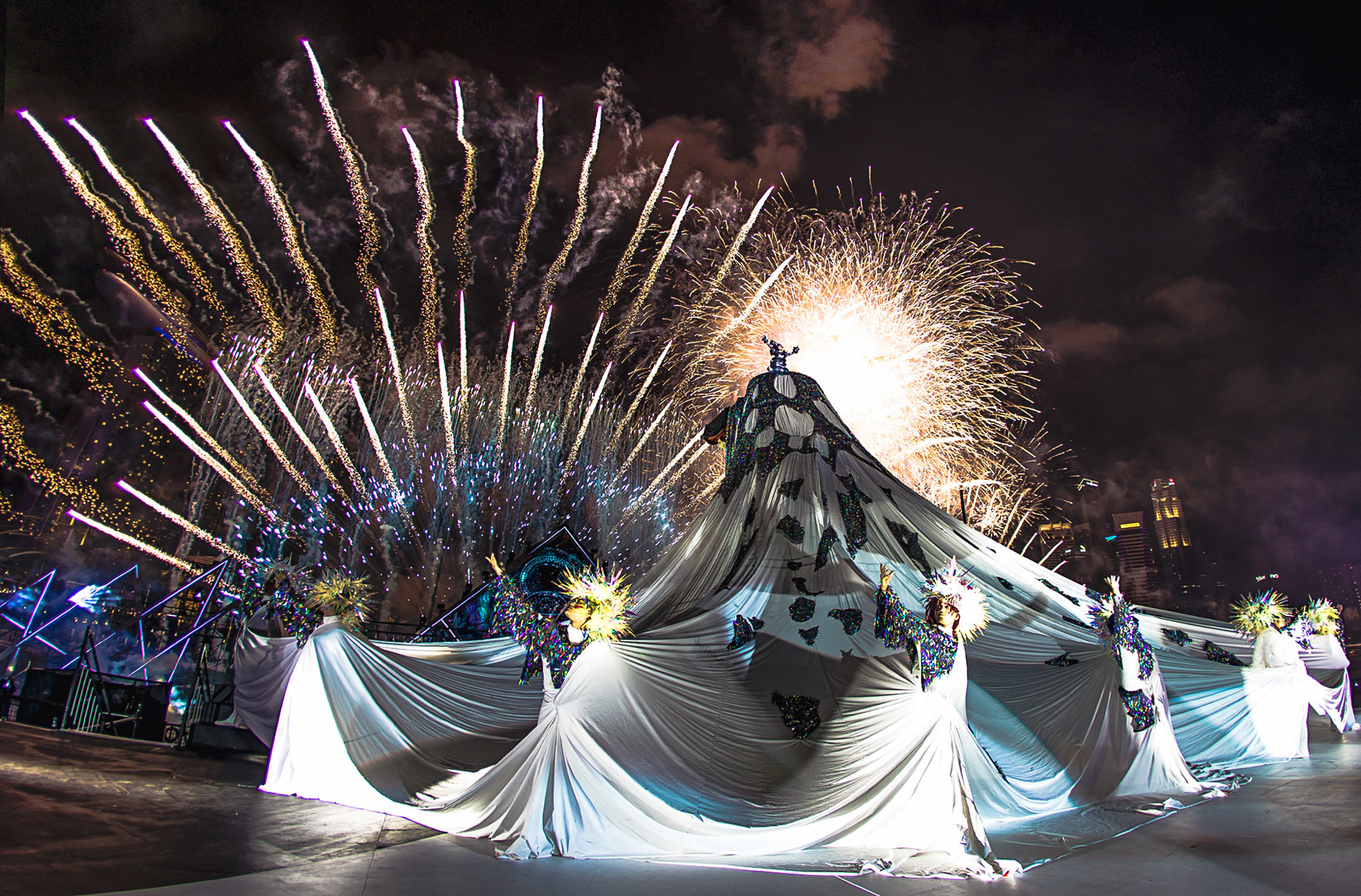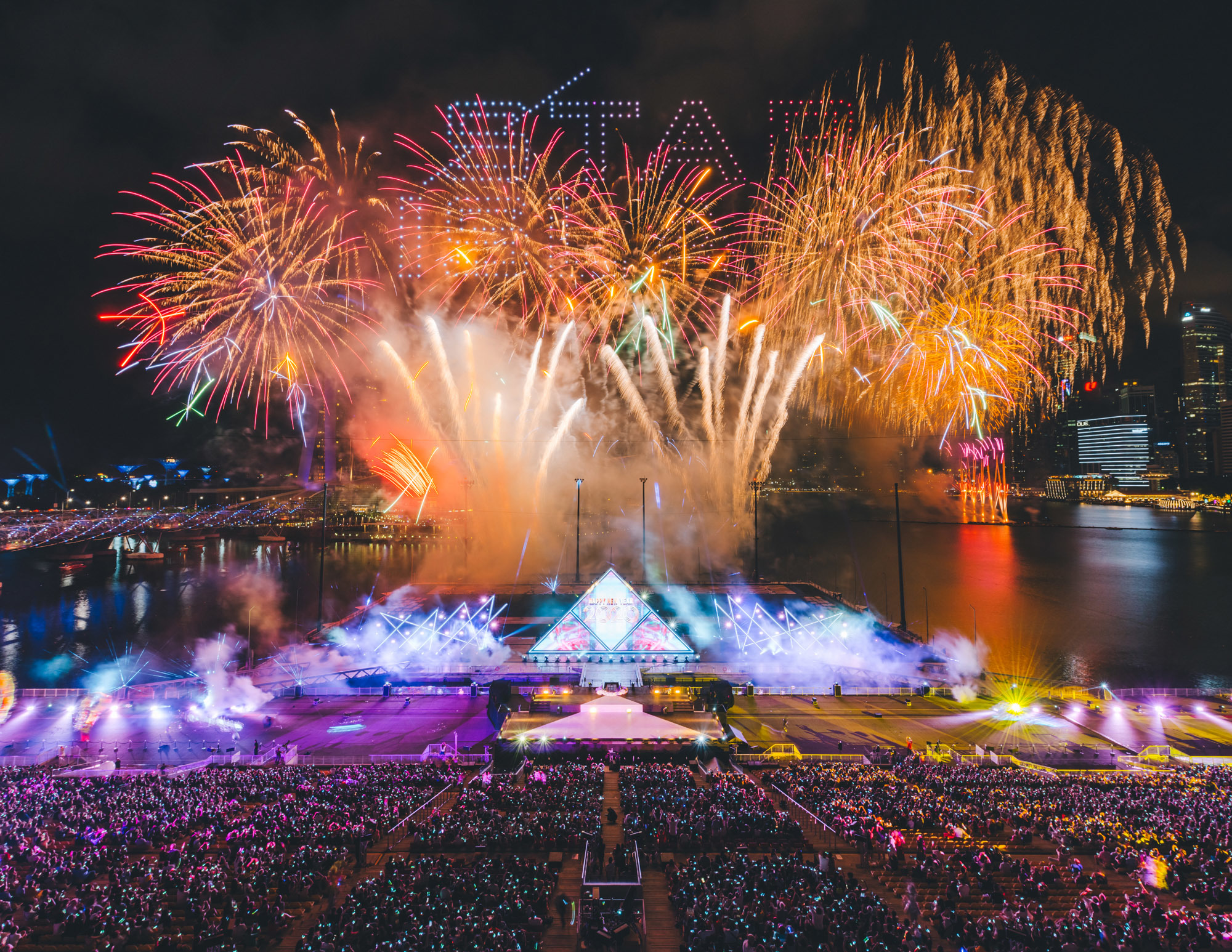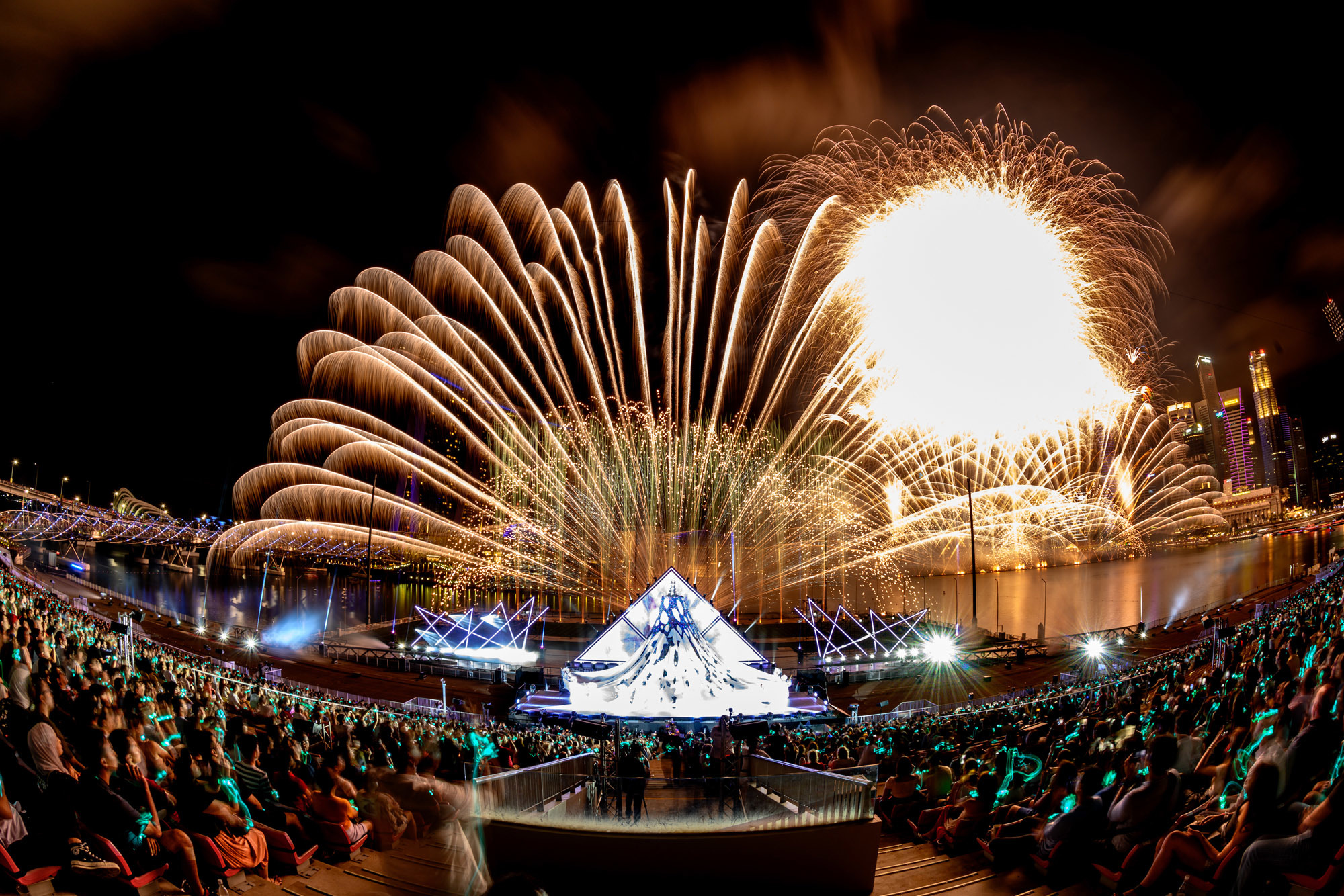 この時期のシンガポールは雨期にも関わらず、今年も天候に恵まれた開催当日。夕闇が訪れるとともに来場者たちのカウントダウンへの期待が高まるなか、心地よい3Dサウンドが人々の心を和ませた後、花火がスタート。背後にアイコニックなマリーナベイ・サンズと光り輝く高層ビル群がそびえる絶好のシチュエーションのもと、1発目の花火が打ち上がると会場には大きな歓声が。