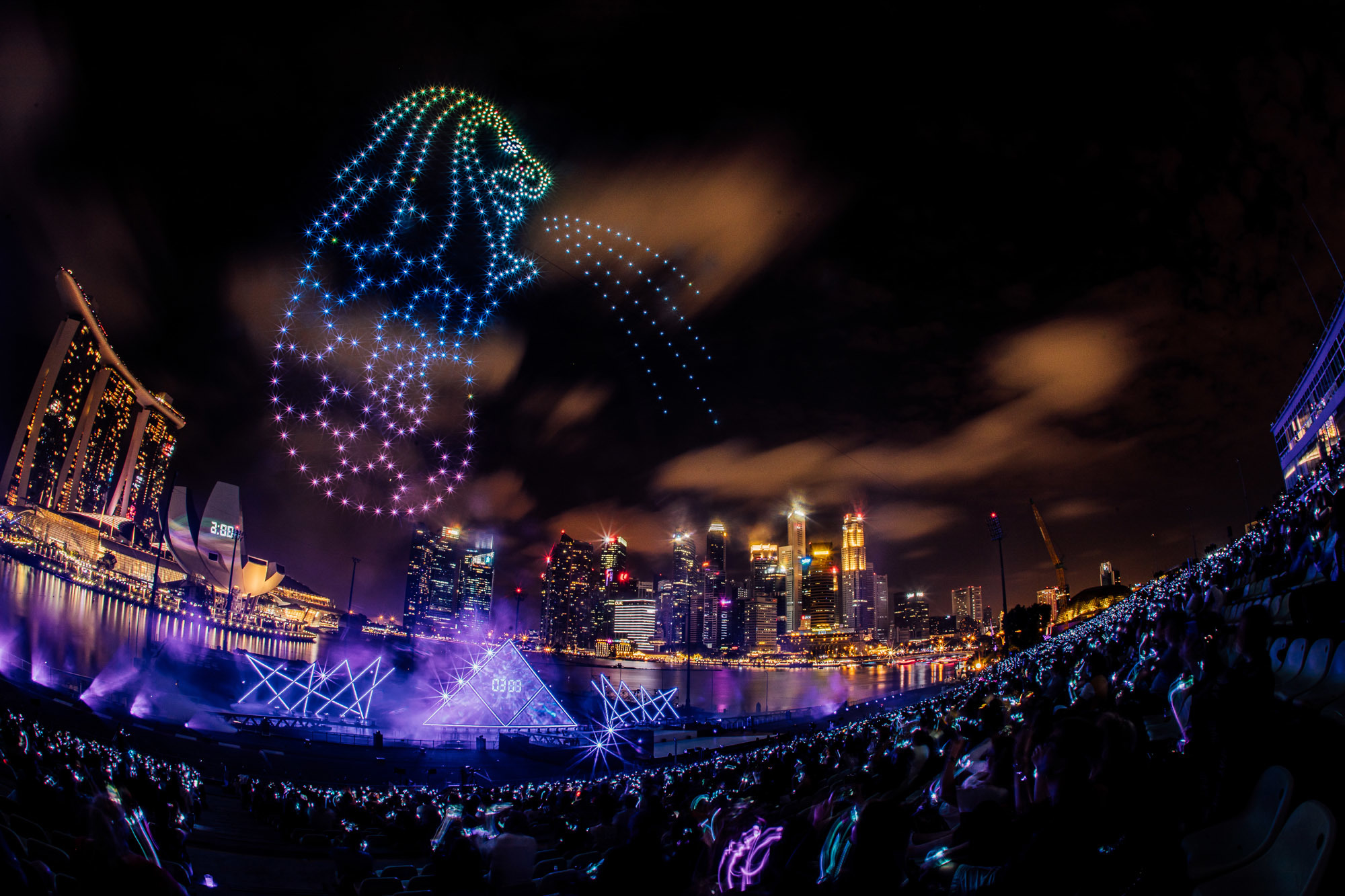 今回夜空を舞ったのは花火だけでなく、500台にも及ぶドローンも。ひとつひとつのドローンが光の点となり生み出される点描は、まさに最先端のテクノロジーによる革新的アート。クラゲとなって宙を舞ったかと思えば、クジラや大鳥、煌めくダイヤモンド、さらにはロケットが宇宙を飛び交う模様や人間が走る姿など様々な形に変貌。なかでもシンガポールのアイコン的存在、マーライオンになると一際会場が盛り上がる。これまでの「STAR ISLAND」をゆうに超えるその圧倒的なスケール感は、夜空という大きなキャンバスを最大限に活用した本イベントの新たな魅力。世界初となる日本の伝統文化・花火とドローンが相克するその様に誰もが心奪われていた。