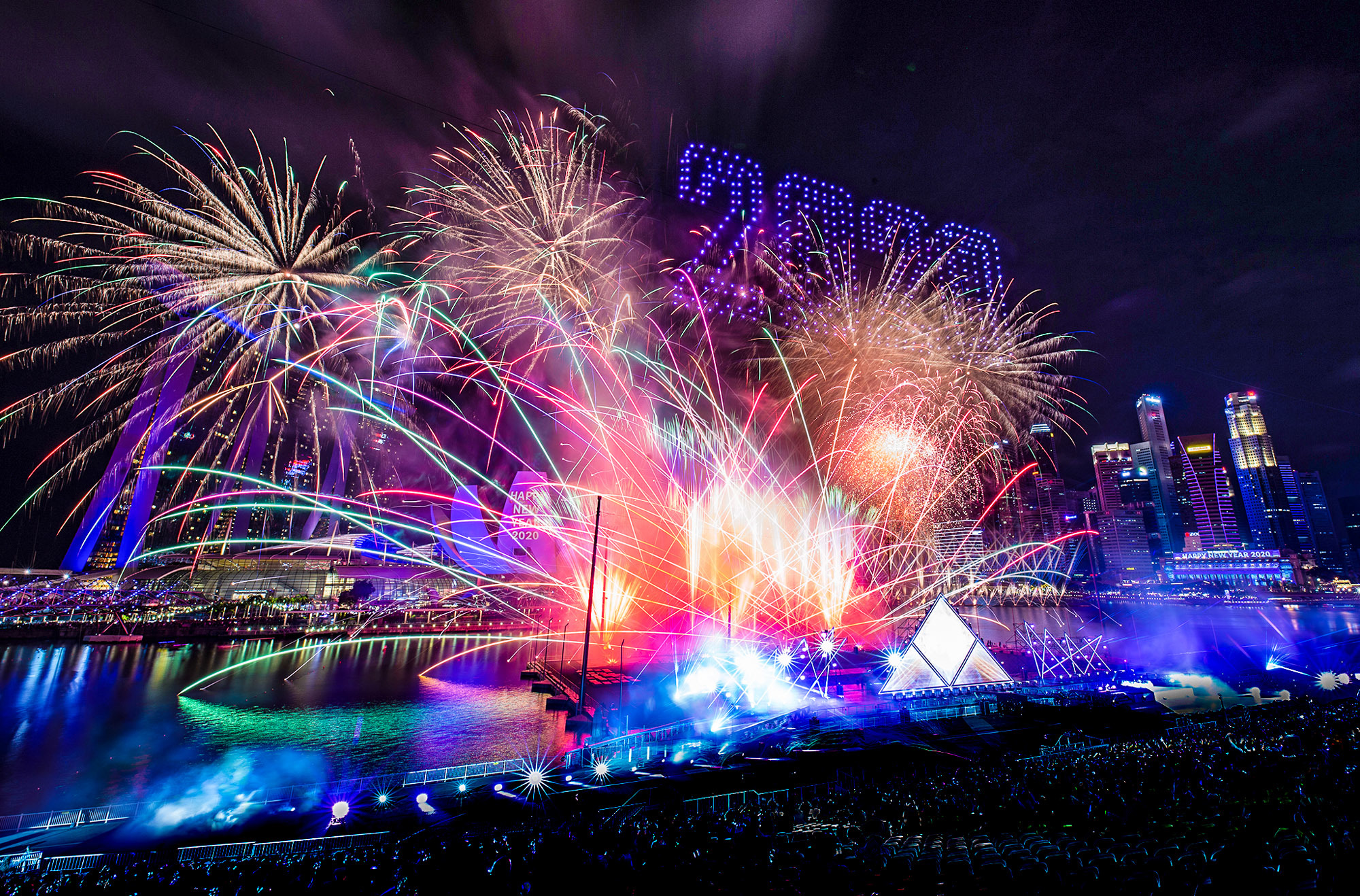 何より最大の見せ場となったのは、やはりカウントダウン。ステージ後方のトライアングルの大型モニターに2020年までの残り時間が刻まれ、それが残りわずかとなると上空にドローンによる時計が出現。そして迎えた2020年、年越しと同時に夜空一面を覆うほどの大量の花火とドローンアートが咲き誇り、メモリアルな瞬間を盛大に演出。まるで昼夜が逆転したかのような光のスペクタクルは、今年もシンガポール随一のカウントダウン・イベント「Marina Bay Countdown Singapore」における大きなクライマックスとなり、会場内でもスタンディングオベーションが巻き起こっていた。