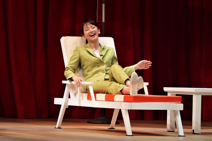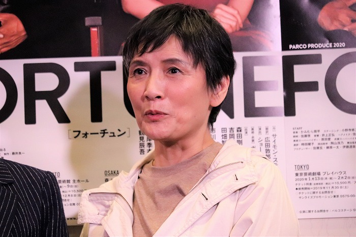 フォーチュンの母親を演じる根岸は「先ほどご覧になったように全員が着替えているか、ステージに出ているかのどっちか、という芝居です。もちろん森田さんはいちばんでずっぱりで大変ですが、誰も休ませない芝居なんです」と困りながらも笑顔を見せていた。また、“息子”森田については「すごく愛おしいです。心がどんどん動きますね。そして役者としては本当によくめげないなあと。すごい台詞量ですし」と感心しきっていた。