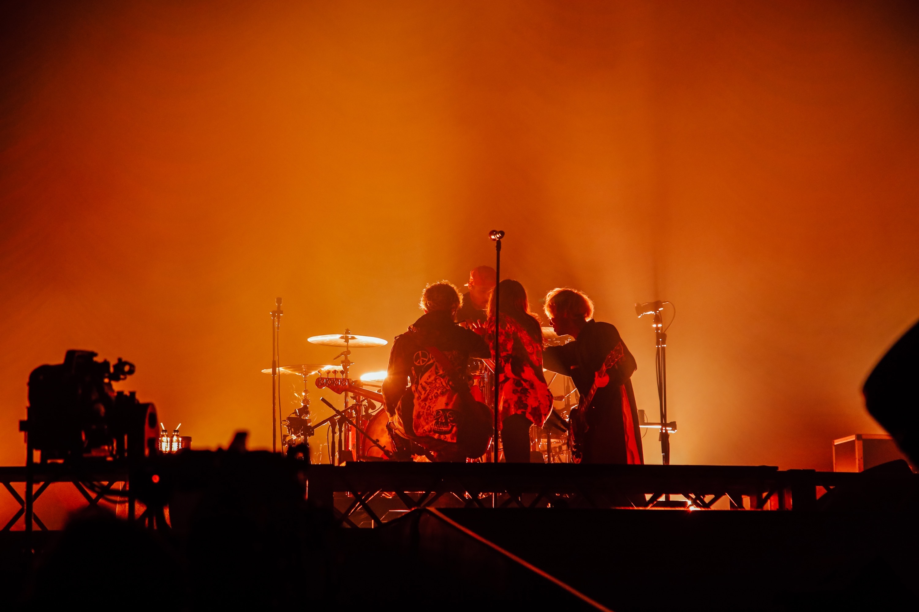 開演前のBGMから、もうエモい。山下達郎、大澤誉志幸らの昭和の名ポップスから、SPANK PAGEら戦友たちの楽曲まで、SUPER BEAVERを構成するタイムレスでジャンルレスなアーティストが国立代々木競技場第一体育館に響きわたる。まさに壮観としか言いようがない大観衆に埋め尽くされた会場は、SUPER BEAVERがついにここまで来た、いや、ここまで愛されてきたのかと知る幸福と、そこにいるだけで同志とすら思える得も言われぬ連帯感に満ちている。オレンジの照明に照らされながら、いつものように、過去最大のステージに、4人が集まっていく……。