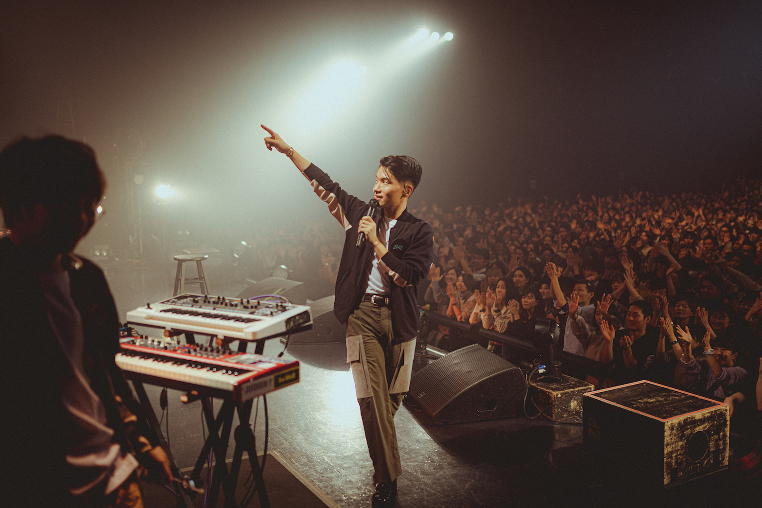 ステージの左手から軽い足取りで現れたSIRUPは、2017年に世に送り出した最初のシングル「Synapse」を歌い始める。一気に興奮が高まった観客たちは、彼がステージ上を移動するだけで割れんばかりの声を上げ、その様子に彼自身も笑みをこぼした。SIRUPとバンドメンバーの全員が、この日会場で販売されたアディダスとのコラボレーションジャケットを着こなしている。音のスケールや、楽曲の展開に合わせて次々に色を変える照明から、ZEPPで格段にパワーを増したSIRUPを1曲目にして十二分に体感できた。「Synapse」から、バスドラムの音4つでそのまま「Pool」へ。ビビッドなネオンカラーの光を浴びながら、サビでSIRUPと観客たちは「Oh」「ahh」「Oh」「ahh」と声を交わした。2番に差し掛かったところで音源にはないファンクテイストのライブアレンジを挟み、アウトロではのびのびとしたフェイクを披露する。