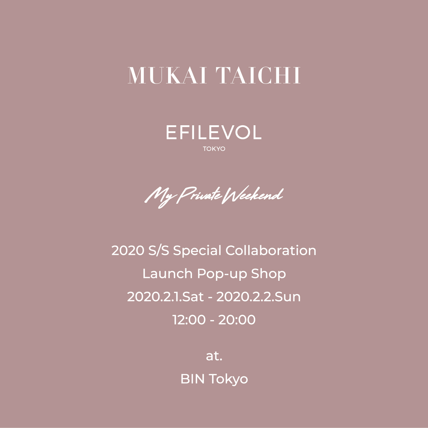 2020年春夏シーズンに『TAICHI MUKAI x EFILEVOL 2020S/S Collection“My Private Weekend”』と題したコラボレーションを行い、全国のEFILEVOL取り扱い店舗にて2月1日にコラボアイテムが販売される。今回のコラボレーションでは向井が実際にデザインに携わり、サイズ感はメンズ/レディースどちらが着ても良いバランスになるように計算され、普段洋服を着る上で大事にしているこだわりの要素を落とし込んだ、綺麗な中にも遊び心のあるコレクションとなっている。