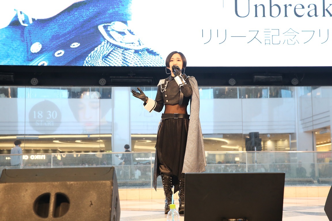 会場にはおよそ1000人を超えるファンが来場し熱気で満ちあふれる中、イベントがスタート。シングル表題曲でTVアニメ「インフィニット・デンドログラム」オープニングテーマの「Unbreakble」、カップリングの「Break down」の2曲を披露した。