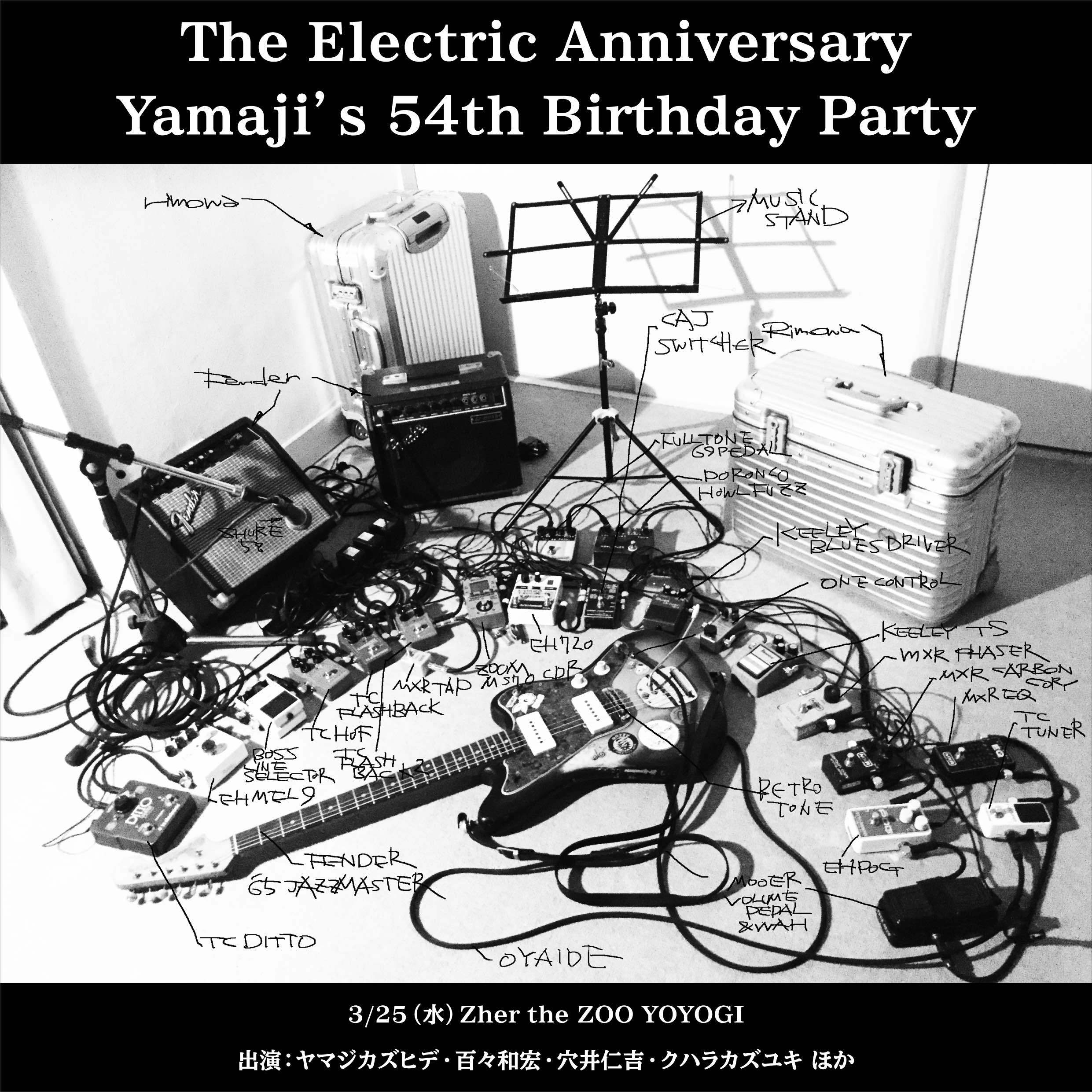 戸川純のヤプーズにギタリストとして参加したり、毎年フジロックに池畑潤二(ex.THE ROOSTERS)のROUTE 17 Rock’n’Roll ORCHESTRAのメンバーとして出演したりと、近年は数々のミュージシャンとセッション活動を行なうなど、表現する場所を広げているヤマジ。今回のライブは、百々和宏(MO’SOME TONEBENDER)、穴井仁吉(TH eROCKERS)、クハラカズユキ(The Birthday)らと共に、自身に影響を与えた洋邦のロックの名曲のカバーを中心として行うとのこと。